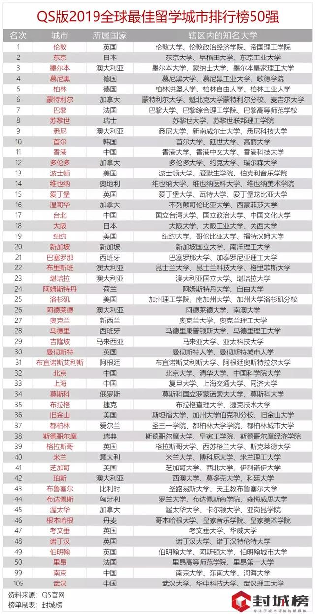 榜爷从QS官网获悉,此次最佳留学城市的评比,只面向满足以下两个条件的城市:一是常住人口超过25万;二是拥有至少2所大学,且这2所大学被最新的QS大学排行榜收录。经过门槛筛选之后,2019年全球共有120个城市满足上述条件。