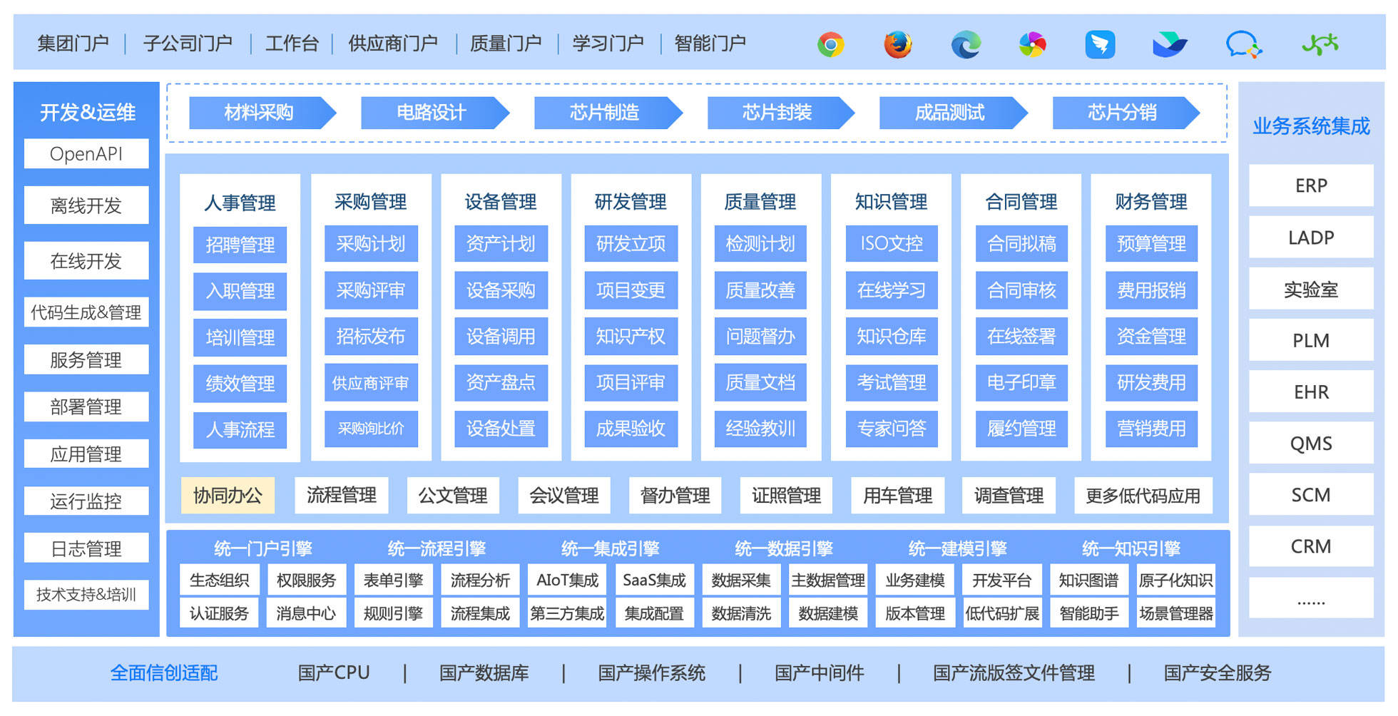 基于半导体企业管理需求与数智化应用趋势,蓝凌整合行业领先的门户、BPM流程、低代码等能力,形成“全新基座+场景应用”的半导体企业数智化办公解决方案,支撑供应商门户、研发门户、人事流程、质量流程、合同流程等应用,加速企业数智化转型与发展。