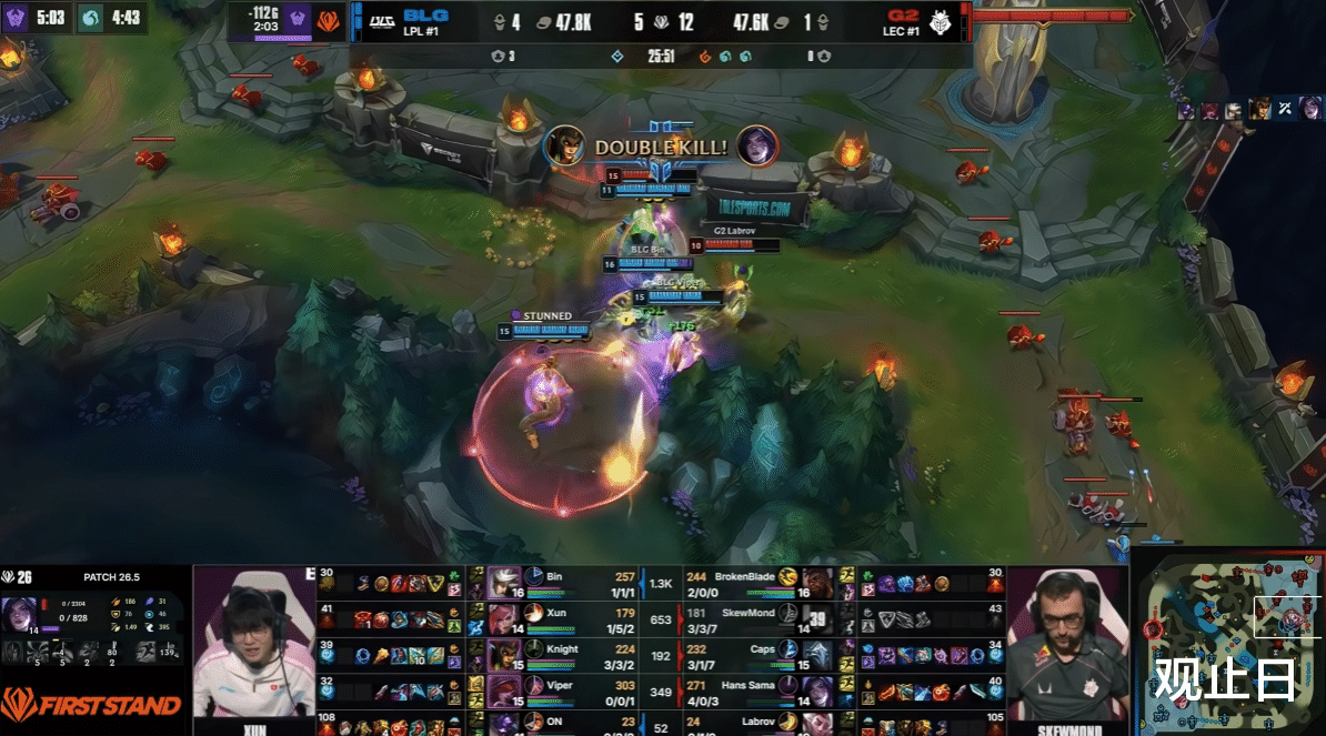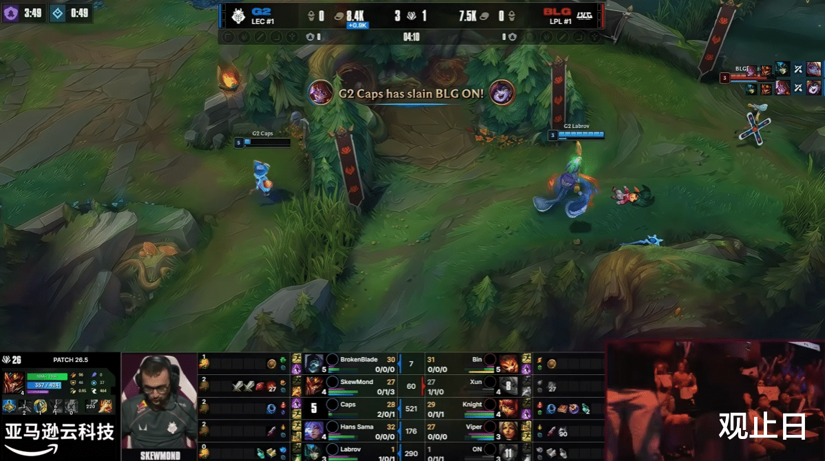 3分钟河道团战,Xun波比虽拿一血,但Caps阿萝拉支援到位反杀两人,G2打出1换3。中期Caps多次游走收割,SkewMond皇子节奏拉满。
