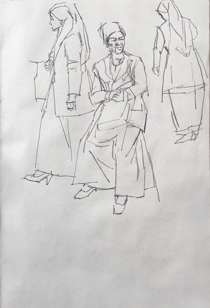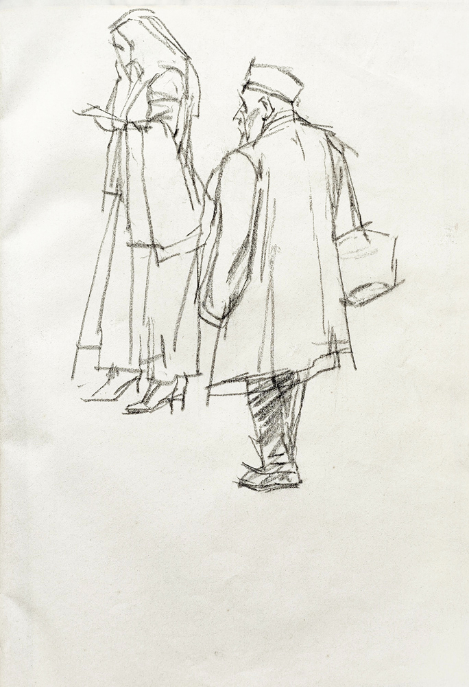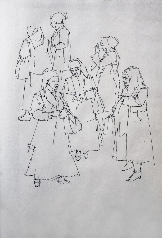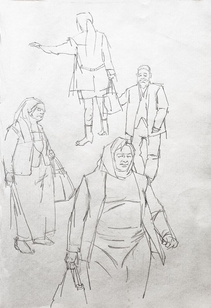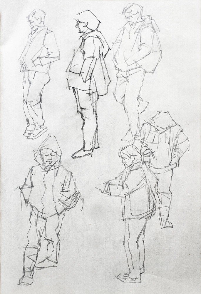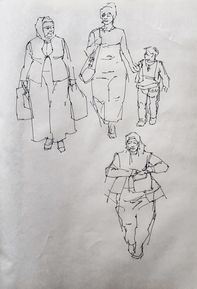 马振江先生笔下的新疆动态素描,恰似一卷流动的胡旋舞,未舞先醉。那牵手前行的维吾尔族孩童,步履如天山雪水般轻盈,衣袂翻飞似孔雀开屏,每一步都踏出西域古道的驼铃回响。先生以“线如游龙”之笔,将动态瞬间凝为永恒,恰似敦煌飞天衣袂的飘逸,又似龟兹乐舞的余韵。