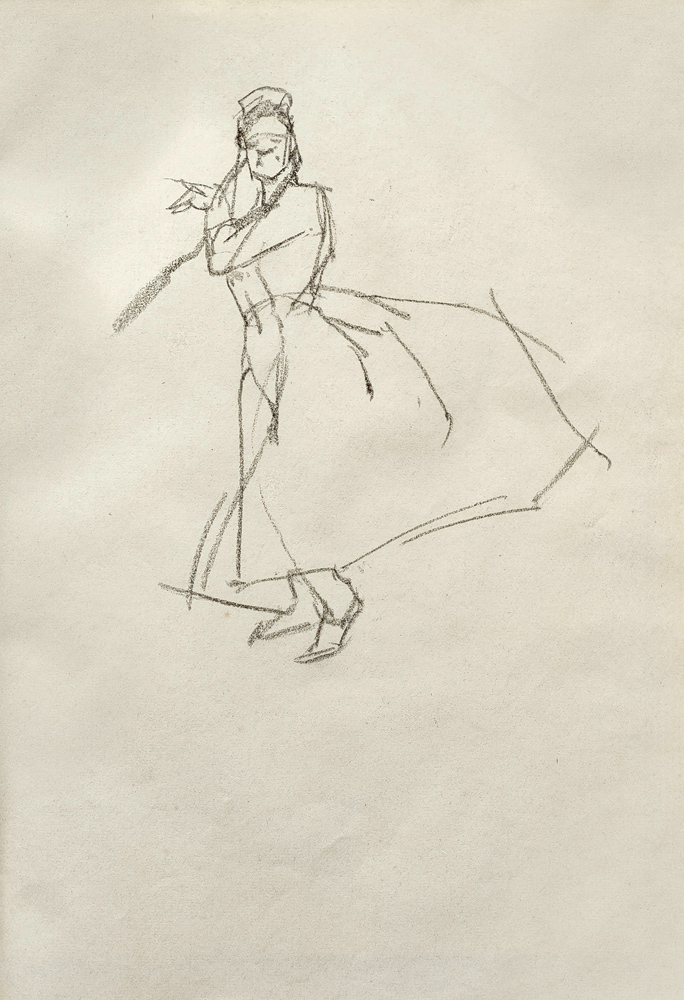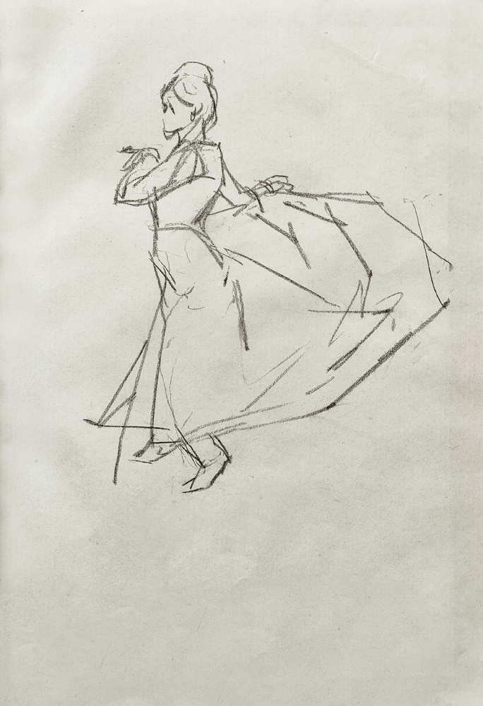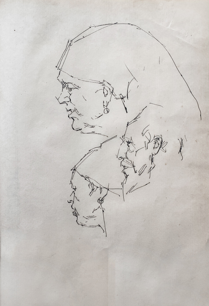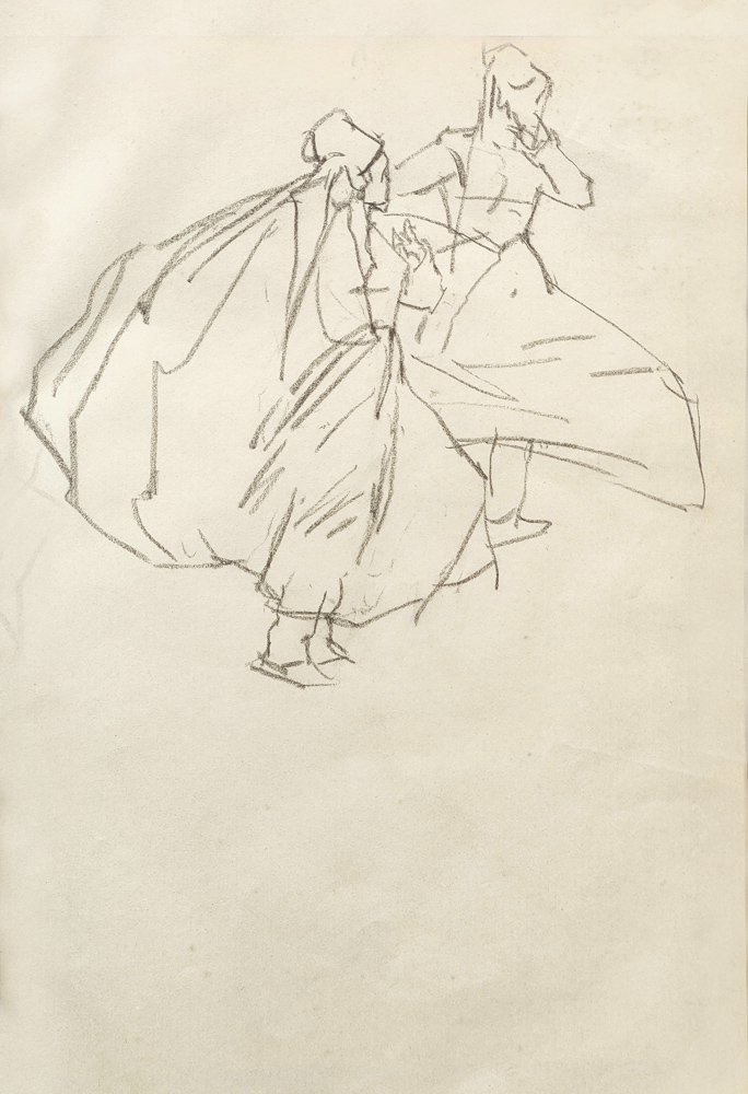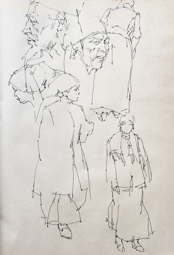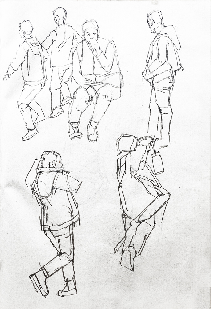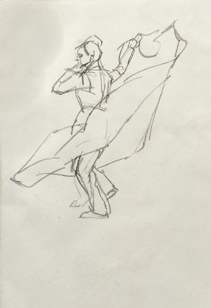 马振江先生笔下的新疆动态素描,恰似一卷流动的胡旋舞,未舞先醉。那牵手前行的维吾尔族孩童,步履如天山雪水般轻盈,衣袂翻飞似孔雀开屏,每一步都踏出西域古道的驼铃回响。先生以“线如游龙”之笔,将动态瞬间凝为永恒,恰似敦煌飞天衣袂的飘逸,又似龟兹乐舞的余韵。