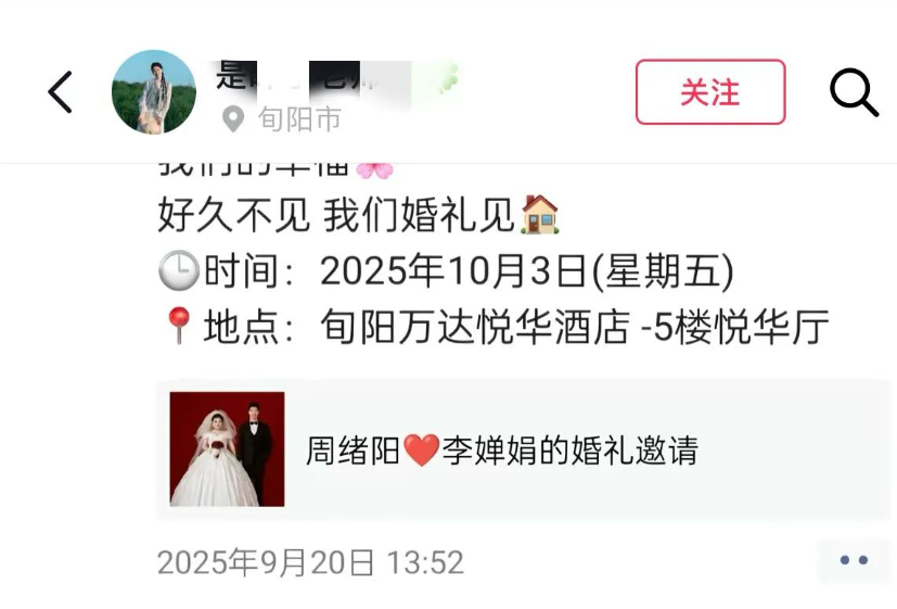 新郎与新娘并非闪婚,他们相恋七年才决定结婚。周绪阳为人低调,很少发朋友圈,从2020年到2025年的五年间,他只发布了9条动态,其中7条都与女友李婵娟相关。