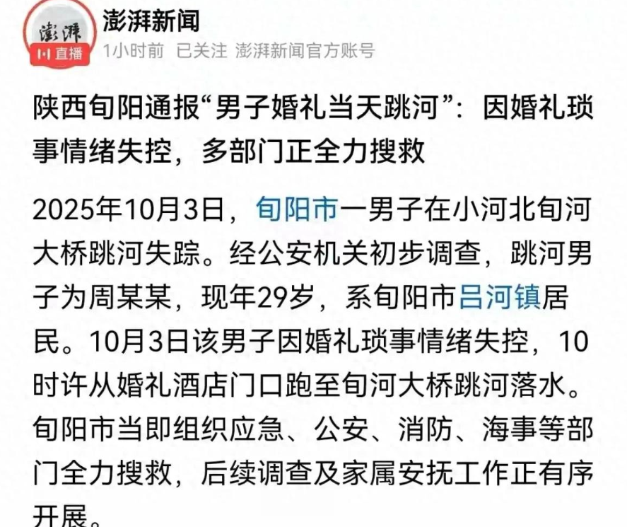 在陕西旬阳,一位新郎在婚礼当天因琐事从桥上跳下,至今下落不明,生死未卜。事件发生后,网络上流传猜测称跳河与彩礼有关,但根据警方调查,官方已基本排除这一可能性。