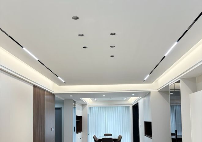 对于灯具,务必选择防眩光灯具,见光不见灯才是最舒适的。另外,尽量分散光源,例如用灯带、壁灯、落地灯多种光源组合,代替过密的点状射灯,营造层次的灯光环境。