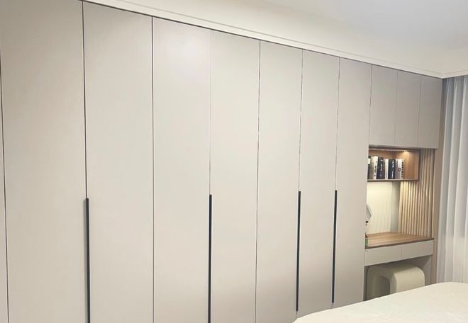 一门到顶的柜子也是目前的主流。但是,理想是将柜子做得拉长通透,现实却是打不开、变形。