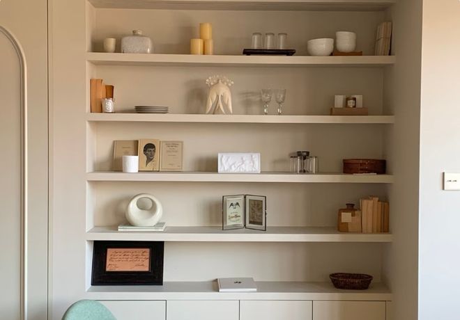 避坑建议:家庭的柜子装修,建议遵循藏八露二原则。80%的柜子做封闭用来收纳不整洁物品,20%可以做开放格,用来展示工艺品、书籍。