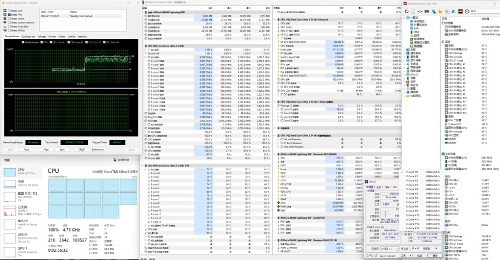 室温24℃,245K不超频,NH-U12A压的太轻松,单烤FPU跑了9分钟温度稳定——CPU温度79℃、CPU核心75℃,CPU封装79℃,只有刚开始拷机的一瞬间冲到82℃,然后就稳定了,CPU核心电压1.34V左右,CPU功耗稳定在151W左右,P核心全核4987MHz左右,E核心全核4588MHz左右。