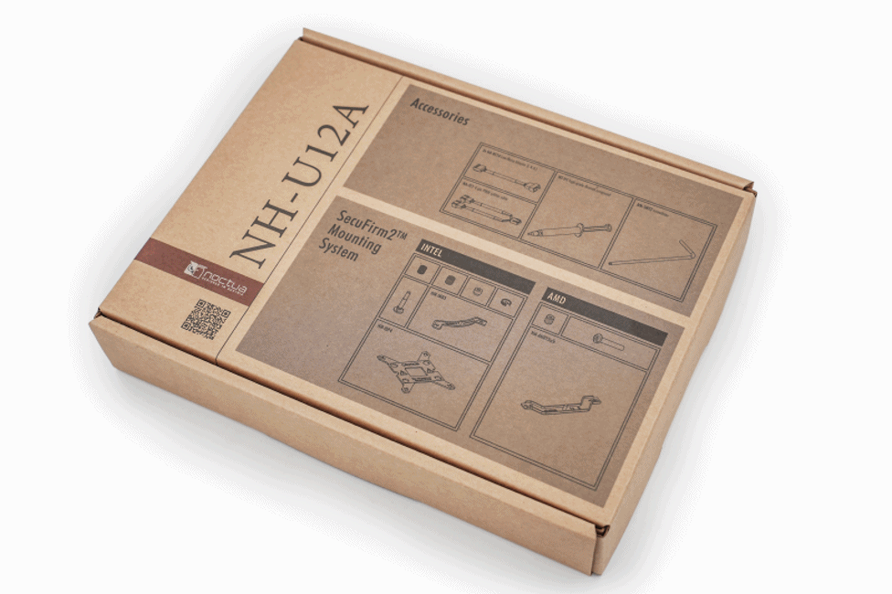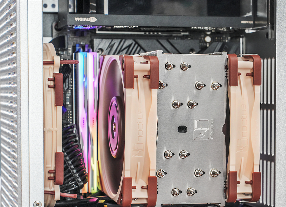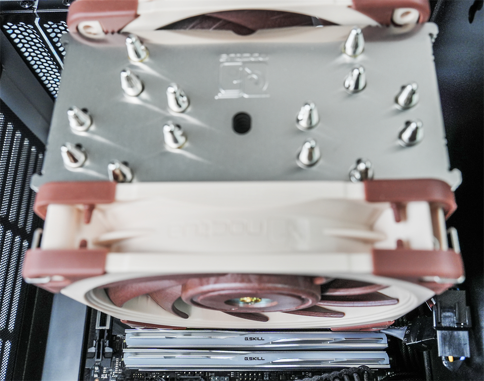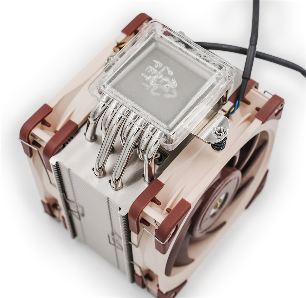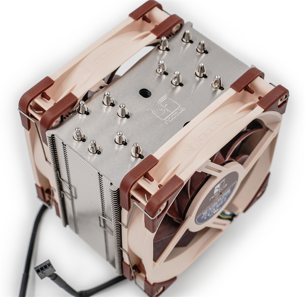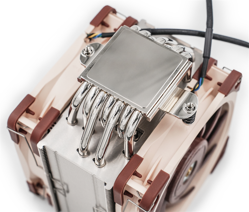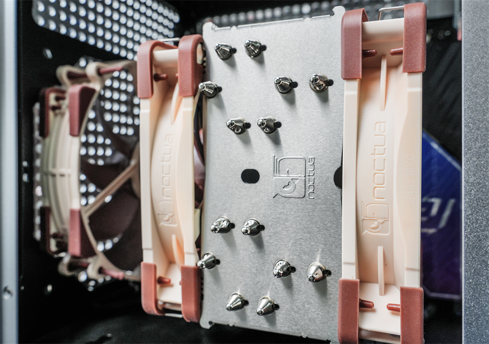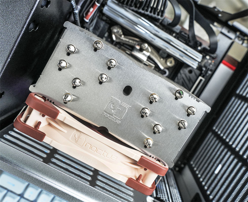 158mm的高度,50片散热鳍片,鳍片之间采用扣Fin工艺,排列整齐,预装的两把NH-A12x25 PWM风扇转速为2000rpm,通过四个角的棕色减振垫能够有效缓冲风扇转动时和散热本体的振动。