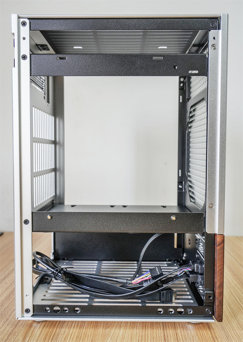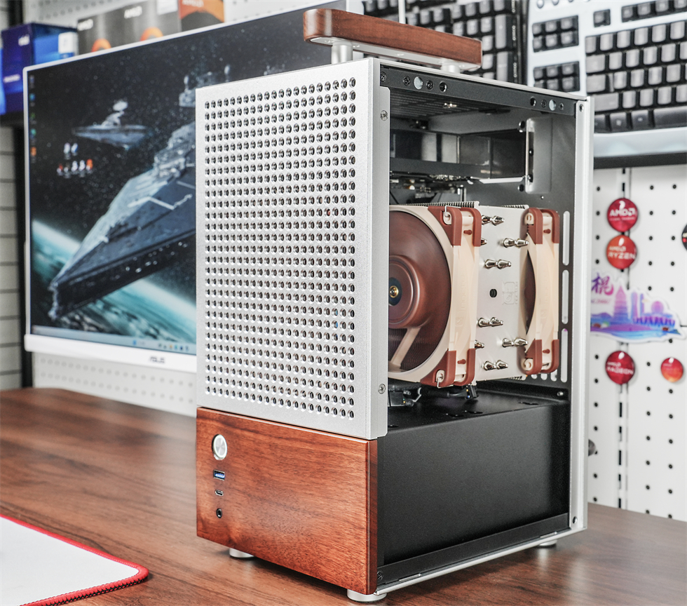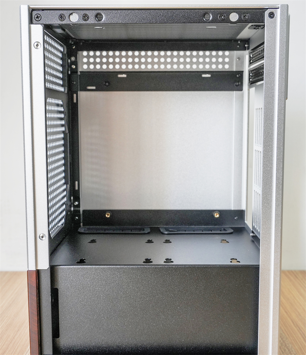 取下磁吸式玻璃侧板,能够看到倒置的主板安装位,支持ITX主板,因为小巧的尺寸所以显卡限长,但是对CPU散热的限高非常友好,160mm上双塔都不是问题。