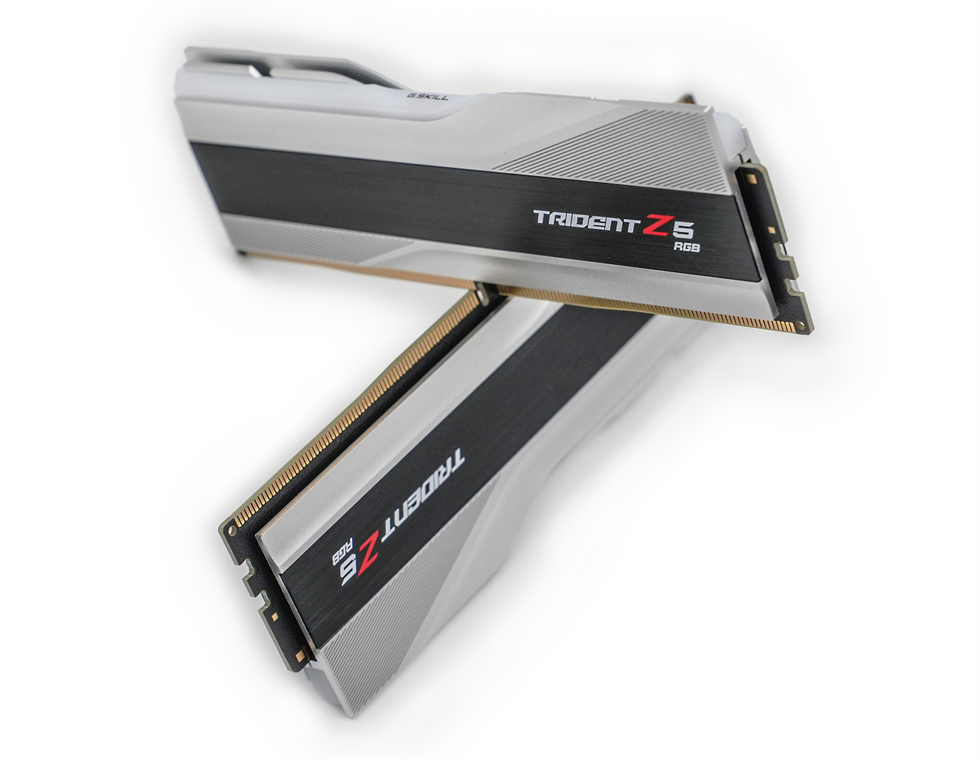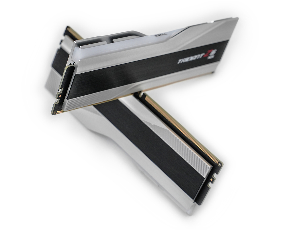 常规造型来两张,银色铝合金散热鳍片表面经过喷砂处理,搭配流线型线条设计,中央采用黑色配色上有TRIDENT Z5 RGB标识。