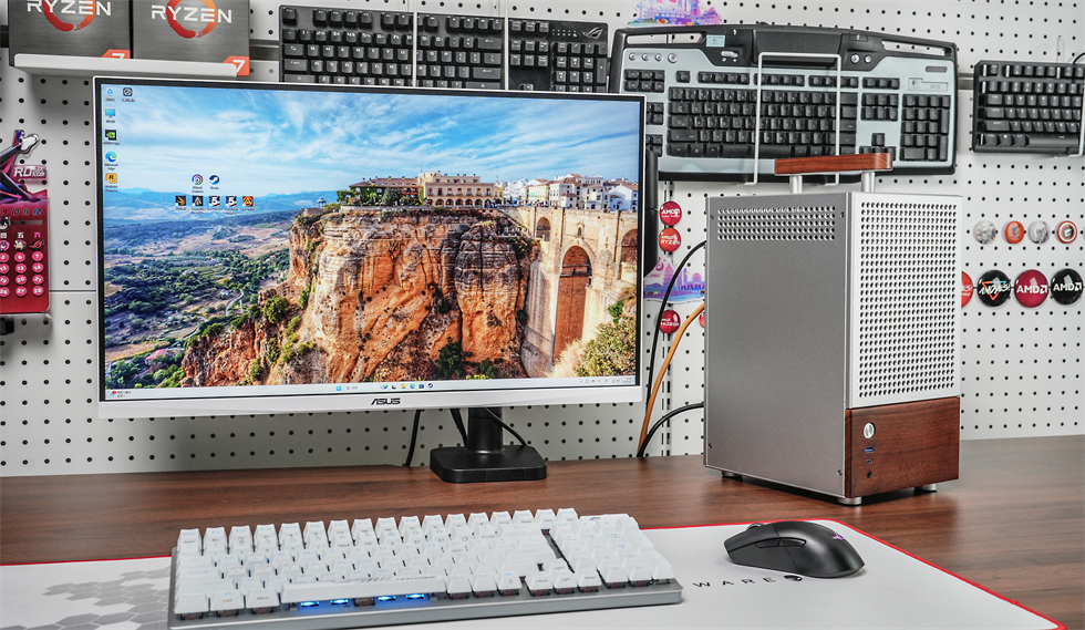 27寸显示器在支架最长拉伸565mm的情况下也可以稳定悬停在各种角度,长度上正好适合北弧M5电动升降桌,我选的是1.6米宽的黑胡桃版本,大桌面让展示装机效果有了进一步提升。