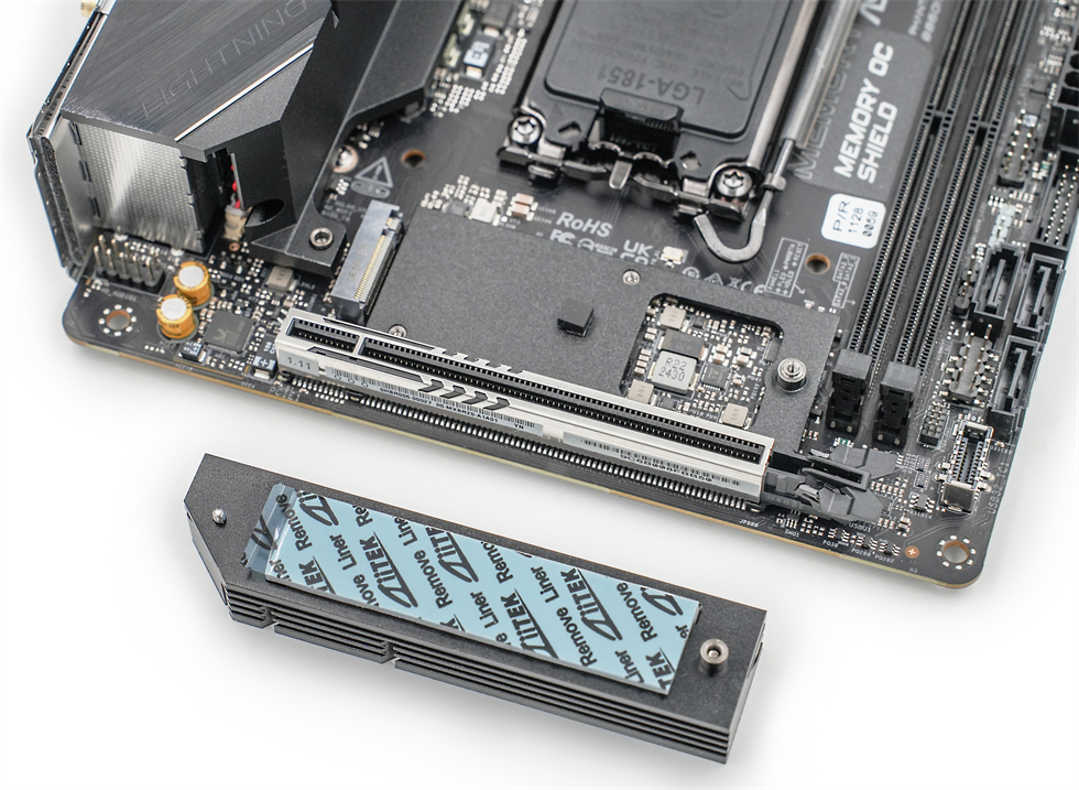 PCIe 5.0×16插槽带有加固设计,还有加强型内嵌金属支架的耳扣,保证重型显卡能妥善安装,M.2硬盘散热装甲取下来拍一张,散热片背面已预装硅胶散热贴,支持2280型PCIe Gen5x4 (128Gb/s) 。