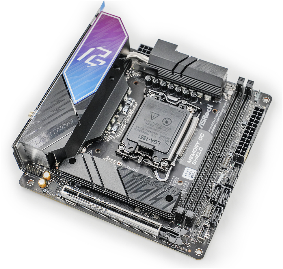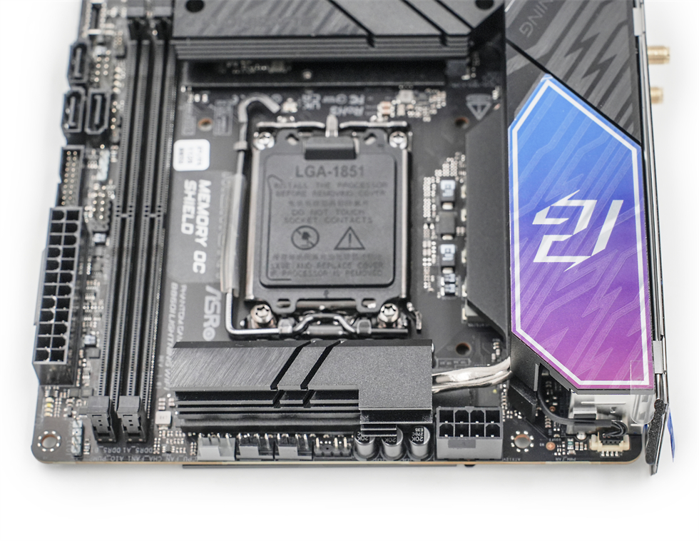 PHANTOM GAMING B860I Lightning WiFi顶部视角,能够看到采用了8pin的CPU供电,两条DDR5内存插槽,支持最高9333+(OC),容量最大128GB,支持XMP 3.0。