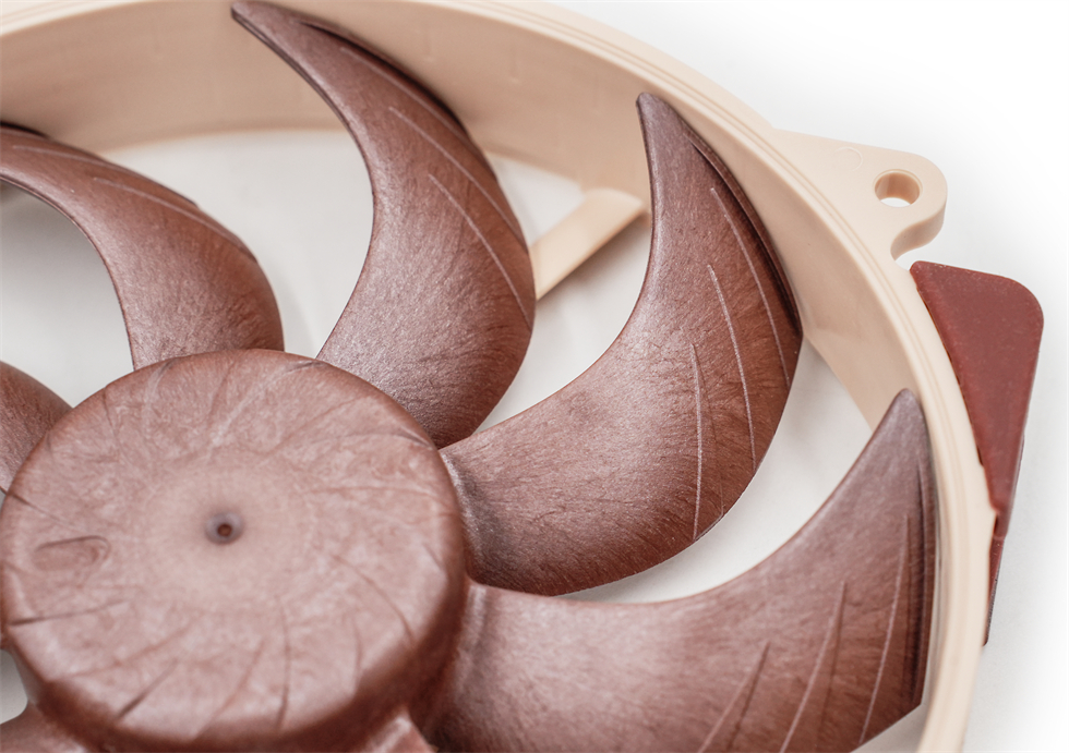 扇叶与NF-A14x25 G2 PWM同样采用同款新型Sterrox液晶聚合物(LCP)复合材料,拥有独特的弯折角度造型,边框内侧还有经典的减噪凹槽设计。