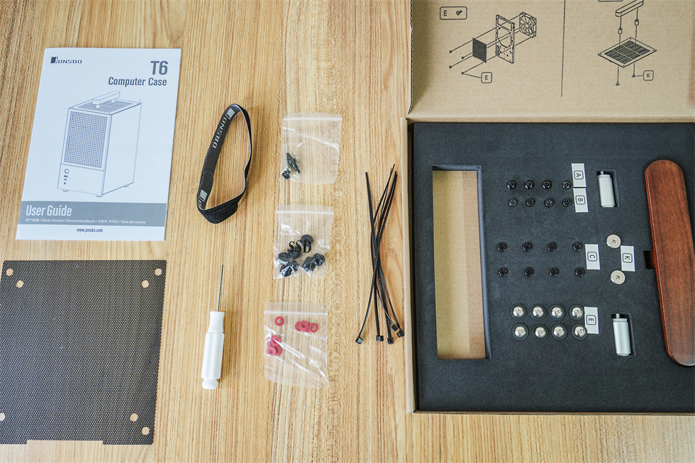 配件来一张,除了各种固定螺丝、拆解机箱的六角螺丝刀、扎带之外,还有防尘网,以及木质把手的固定件,没错,因为把手可以兼任耳机挂架,所以可根据自己选择位置进行固定。