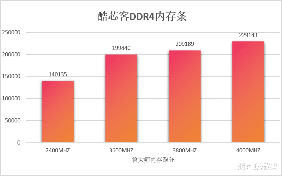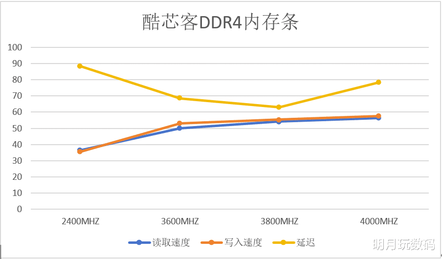 为了让大家能够更直观的看到酷芯客这款内存条的超频性能,我特意将鲁大师和AIDA64的跑分数据作了两个图表,这样大家就能更直观看到内存条在不同频率下的数据变化。通过图表也能看出,内存条超频到4000MHZ下除了延迟外各方面的数据都是最优的。再向上超频就需要调整主板小参,这里就不继续了。