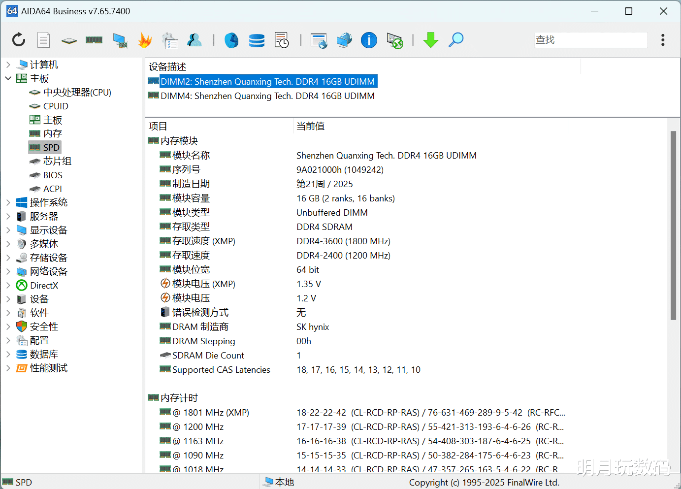 通过鲁大师检测到的内存参数可以看到,酷芯客DDR4内存条在主板未开启XMP配置时频率为2400MHz。通过AIDA64读取的SPD参数中也能验证内存条的品牌、序列号、容量和采用的DRAM颗粒品牌等参数。另外,内存条电压在1.35V,3600MHz时序CL18-22-22-42,给喜欢超频的玩家也留了充足的折腾空间。