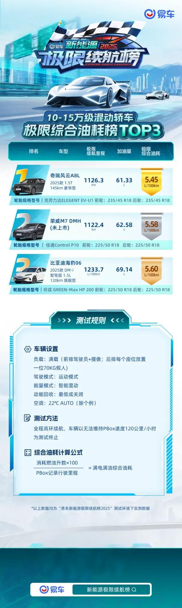 近日,2025易车《新能源极限续航榜》测试结果引发行业震动。在堪称"魔鬼级"的满载120km/h时速极限挑战中,荣威M7 DMH以1122.4km的实测续航突破重围,斩获混动组油耗TOP2、续航TOP5的双重殊荣。这场由权威媒体主导的严苛测试,不仅验证了荣威M7 DMH的真实续航能力,更将其推向中大型混动旗舰的标杆地位。