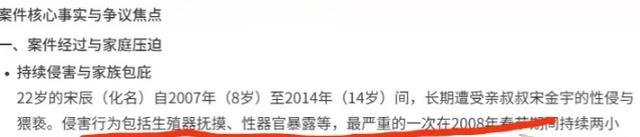 然而这却让宋金宇变本加厉,在2008年春节的时候,宋金宇居然对宋辰上下其手,进行了长达两个小时的猥亵。