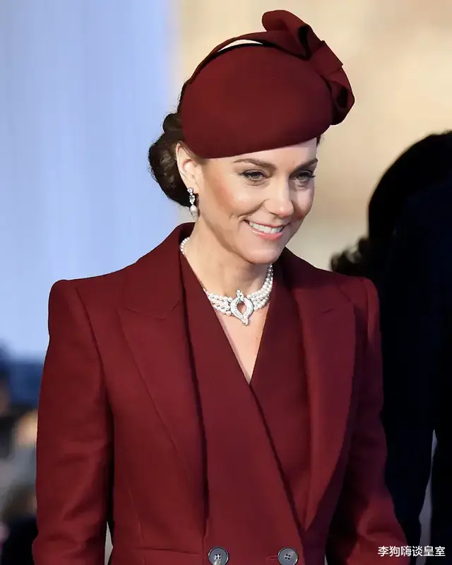 数十年后,2017 年在庆祝女王与菲利普亲王结婚 70 周年的活动上,凯特王妃也佩戴了这条项链。在女王与菲利普亲王的葬礼上,她再次戴上这条项链,以此向二人致以深情悼念。此后,2024 年接待卡塔尔王室的国事访问中,她又一次佩戴了这款珍珠短项链,搭配一件栗色亚历山大・麦昆(Alexander McQueen)大衣亮相。