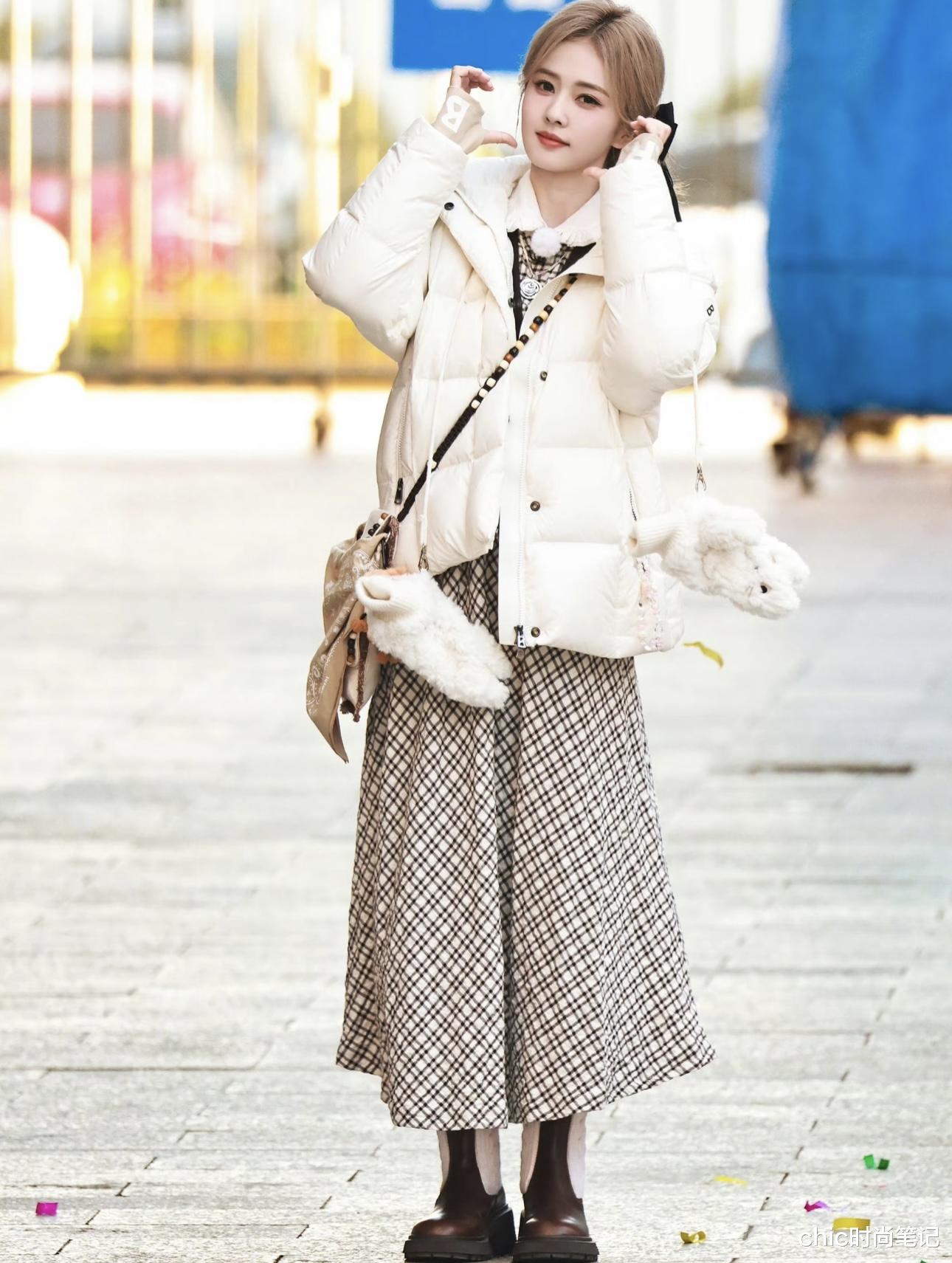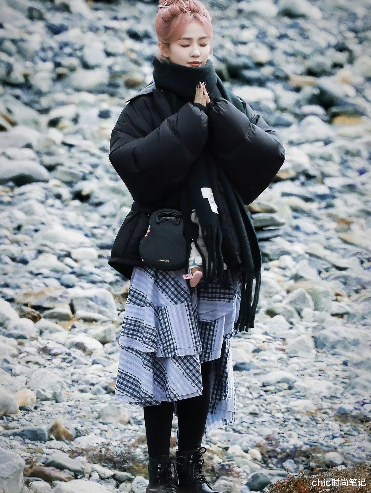 黑色立领的羽绒度搭配不规则蛋糕裙是冬日穿搭的一抹亮色。不规则的格纹蛋糕裙是冷色调,非常的适合秋冬色系。