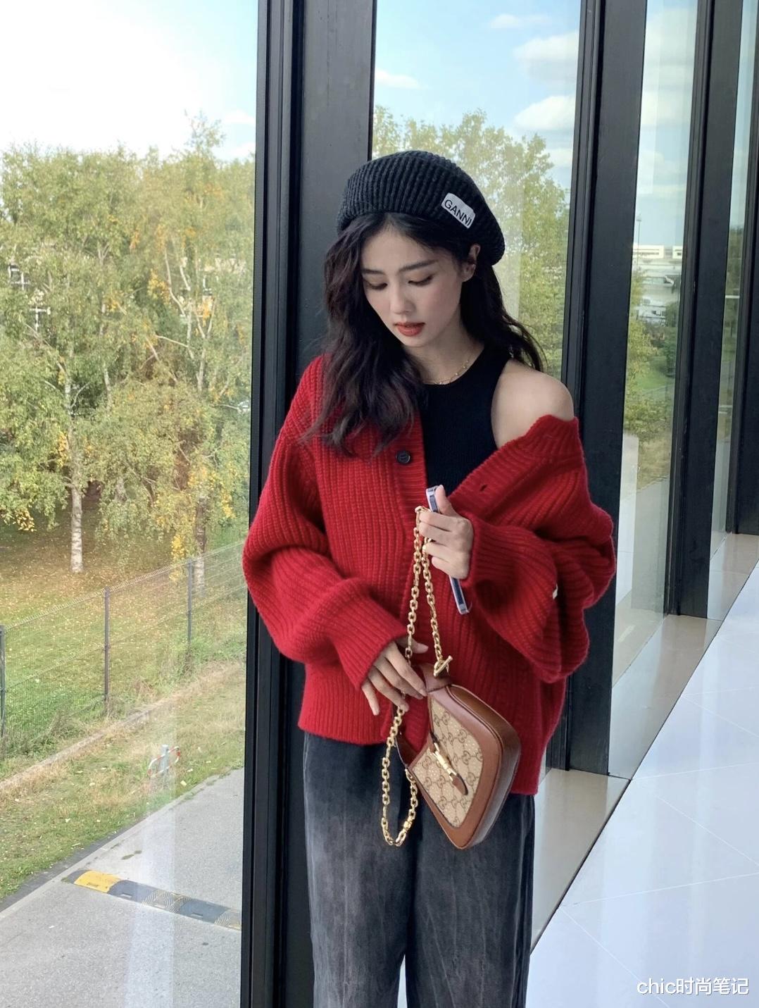 黑色针织背心+正红色针织毛衣开衫,半露肩的款式是“小心机”穿搭法,略带小女人的俏皮感,下身搭配深色牛仔裤,超级明艳。