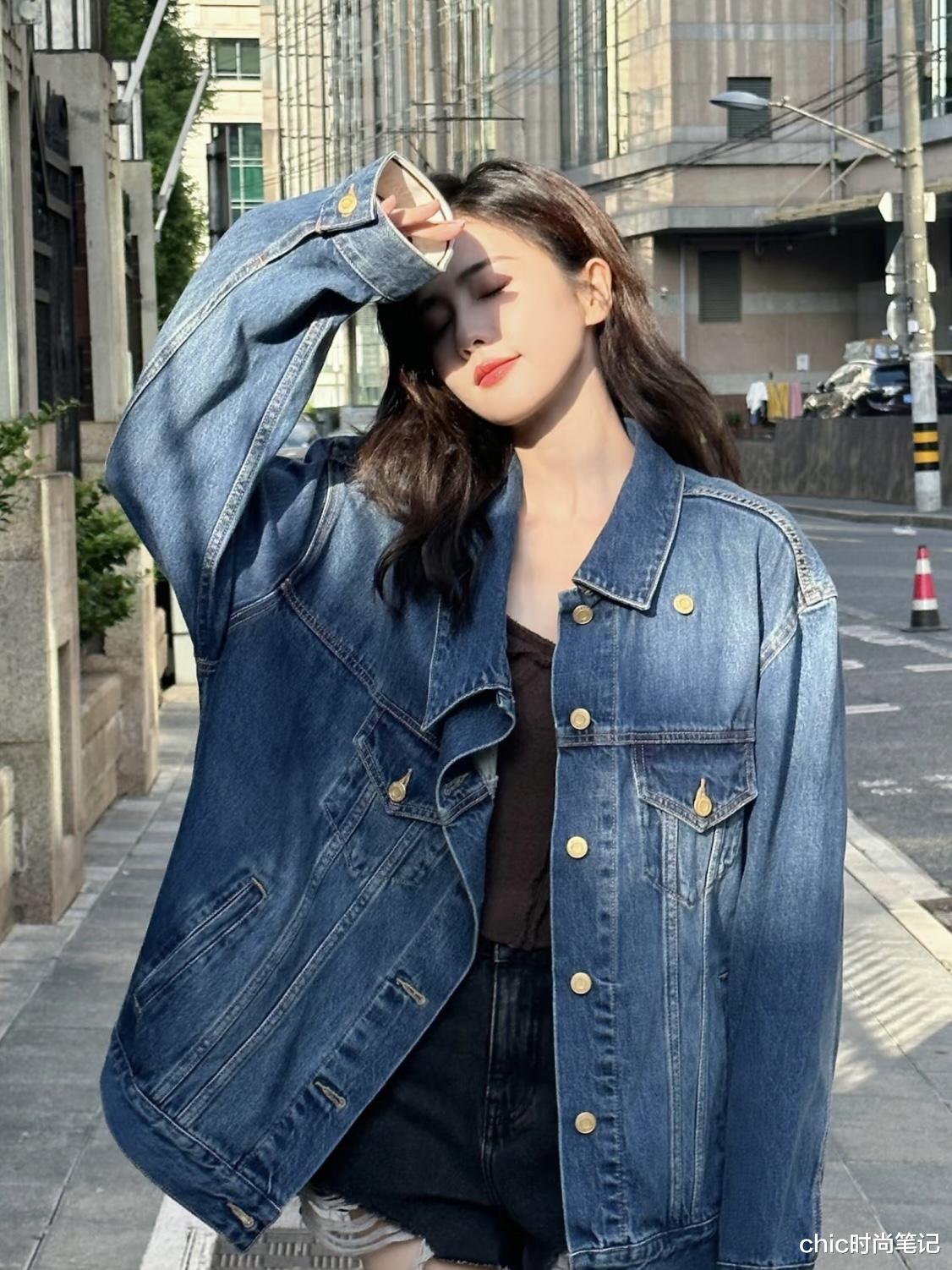 深色牛仔外套很适合秋天穿搭,略微做旧款的风格很有复古感,内搭黑色打底衫和黑色牛仔短裙,休闲感和随性感并存。