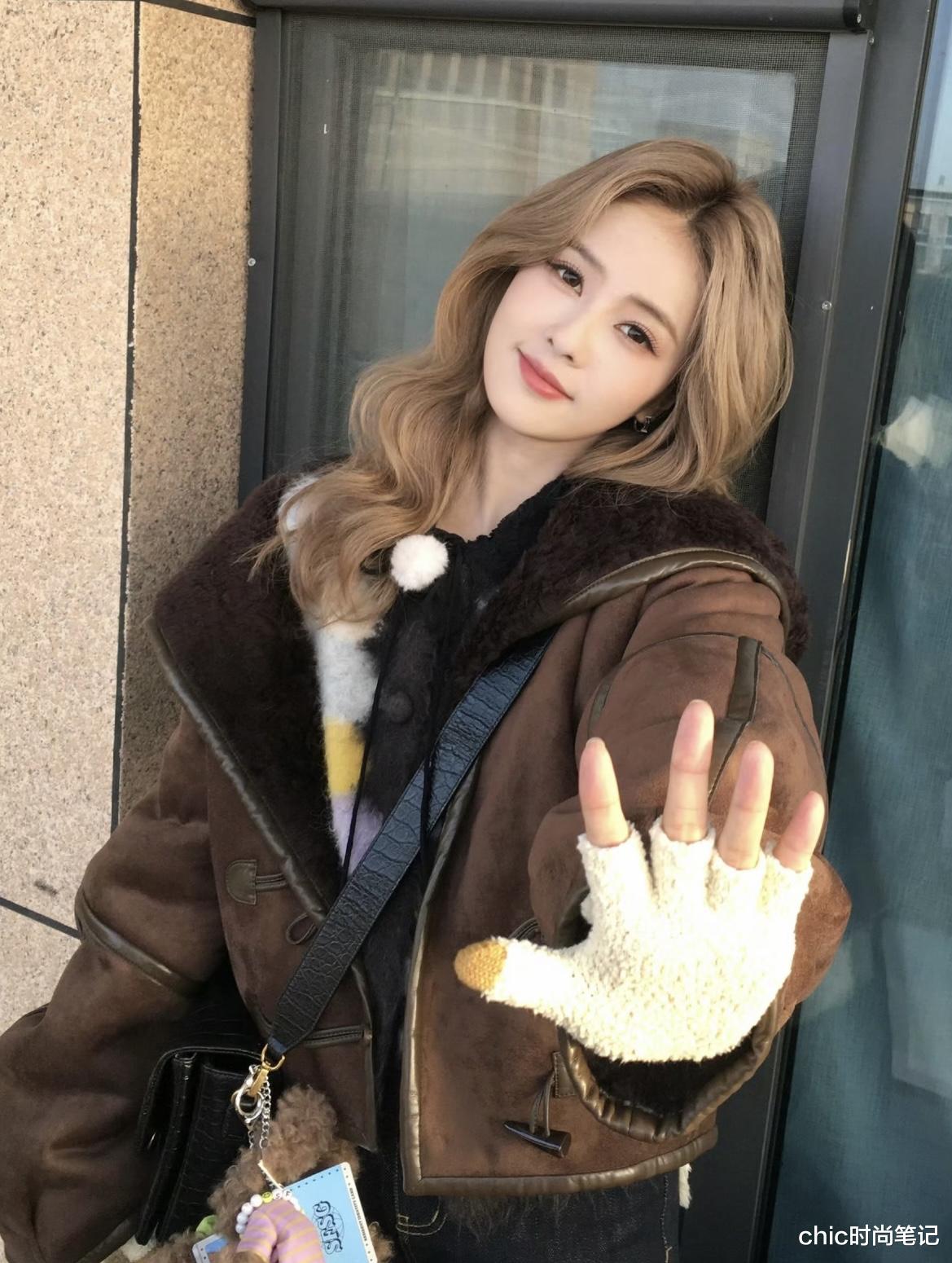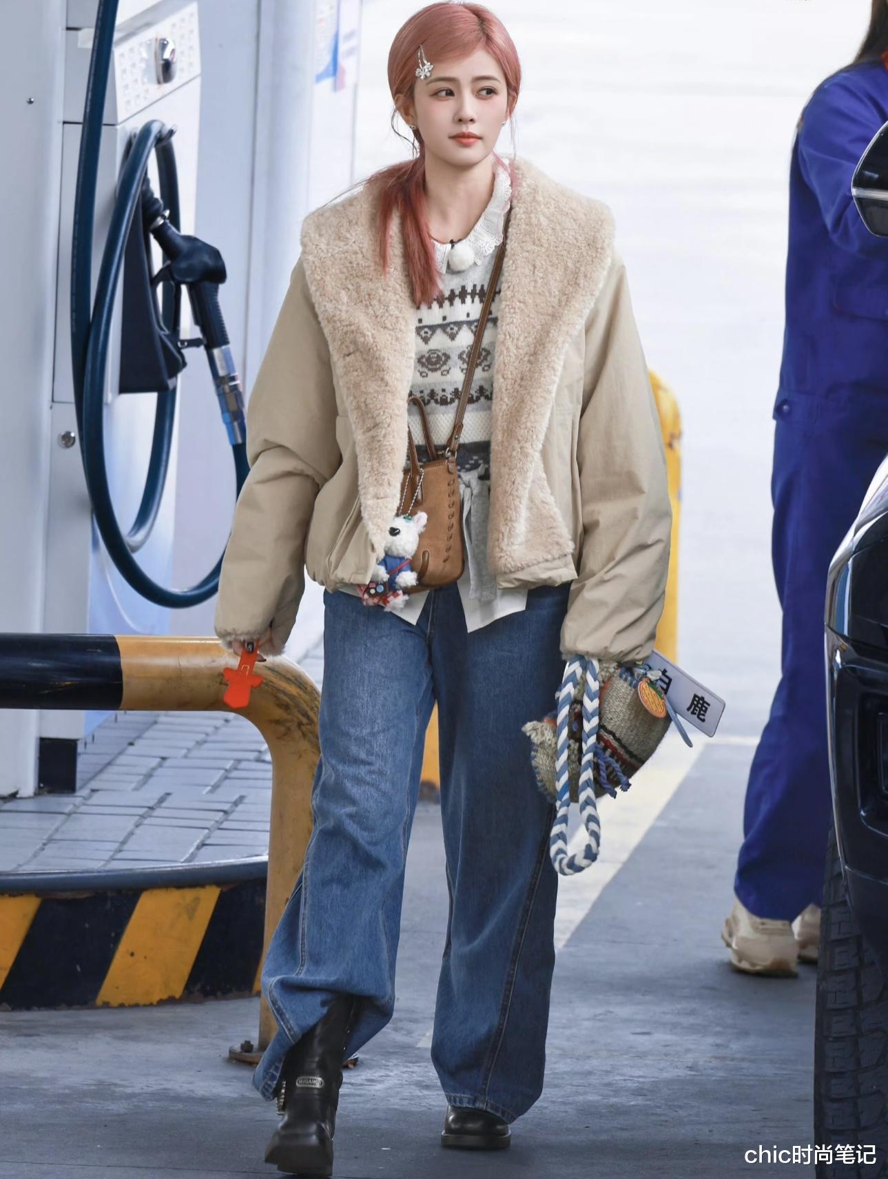 这件皮毛一体是浅色系,内搭复古针织衫和牛仔裤,长款、宽松的牛仔裤休闲又舒适,超日常~