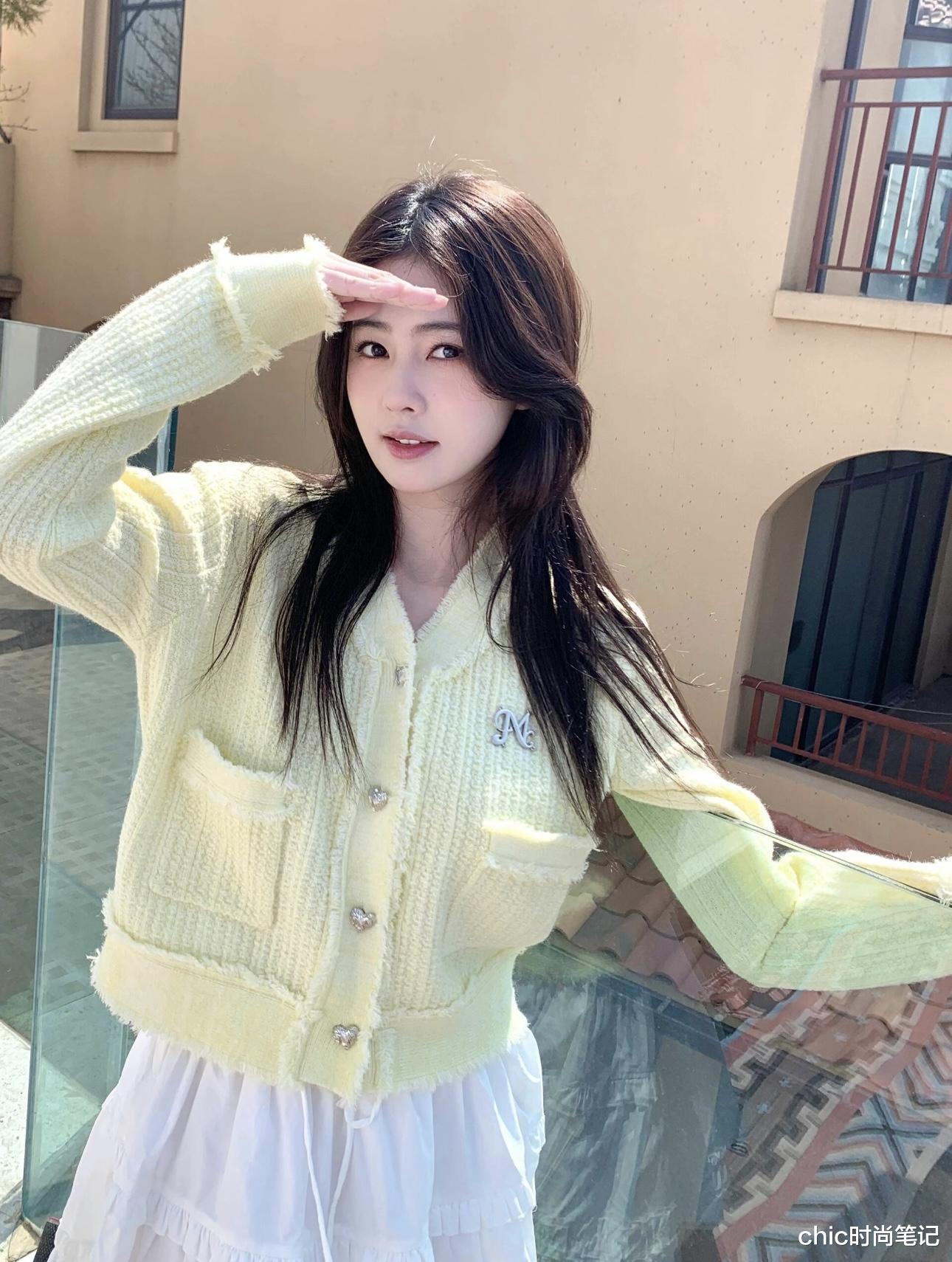 鹅黄色的针织上衣搭配白色纯棉半身裙,也是一套温柔且清新的风格,减龄又俏皮,妥妥的明媚感少女。