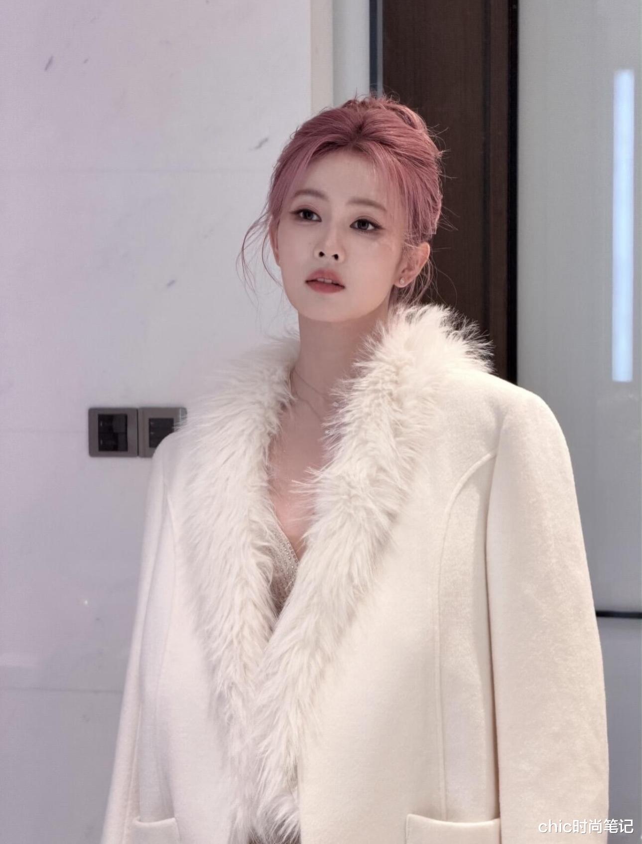 白色呢子大衣做了拼接毛绒,贵气而优雅,内搭连衣裙自带奢华气场,搭配粉色盘发,清冷而孤傲的钓系美人!