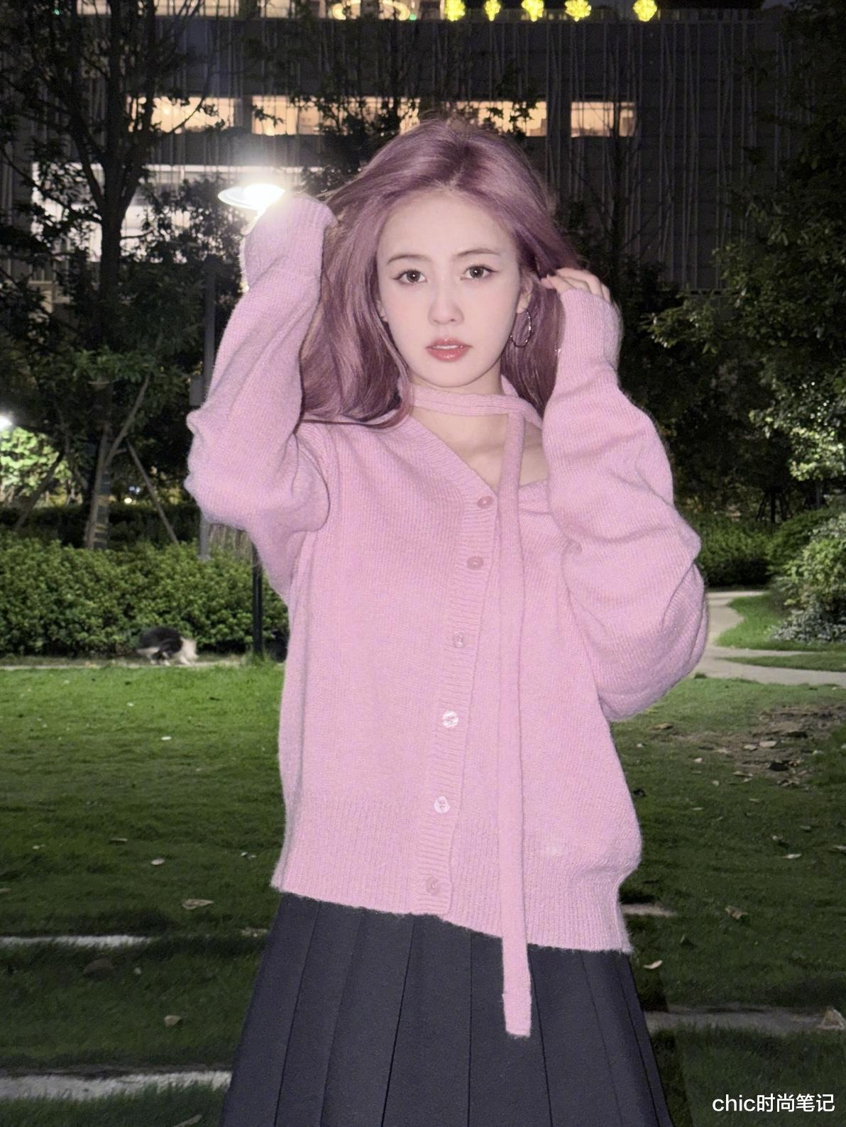 粉色的针织衫自带温柔和高级感,搭配同色系粉色丝带,下身是黑色百褶裙,好少女心的一套look,和粉色头发的适配度也太高了。