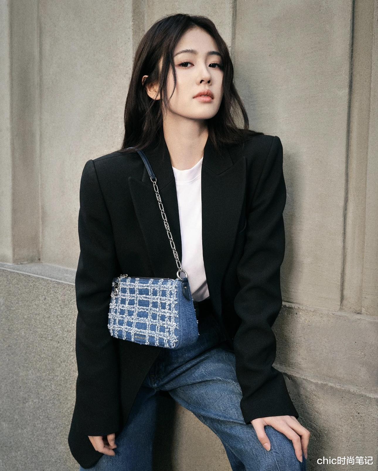黑色西装外套搭配白色打底衫,干练而简约,下身搭配牛仔长裤和牛仔法棍包,好适合通勤的一套穿搭!