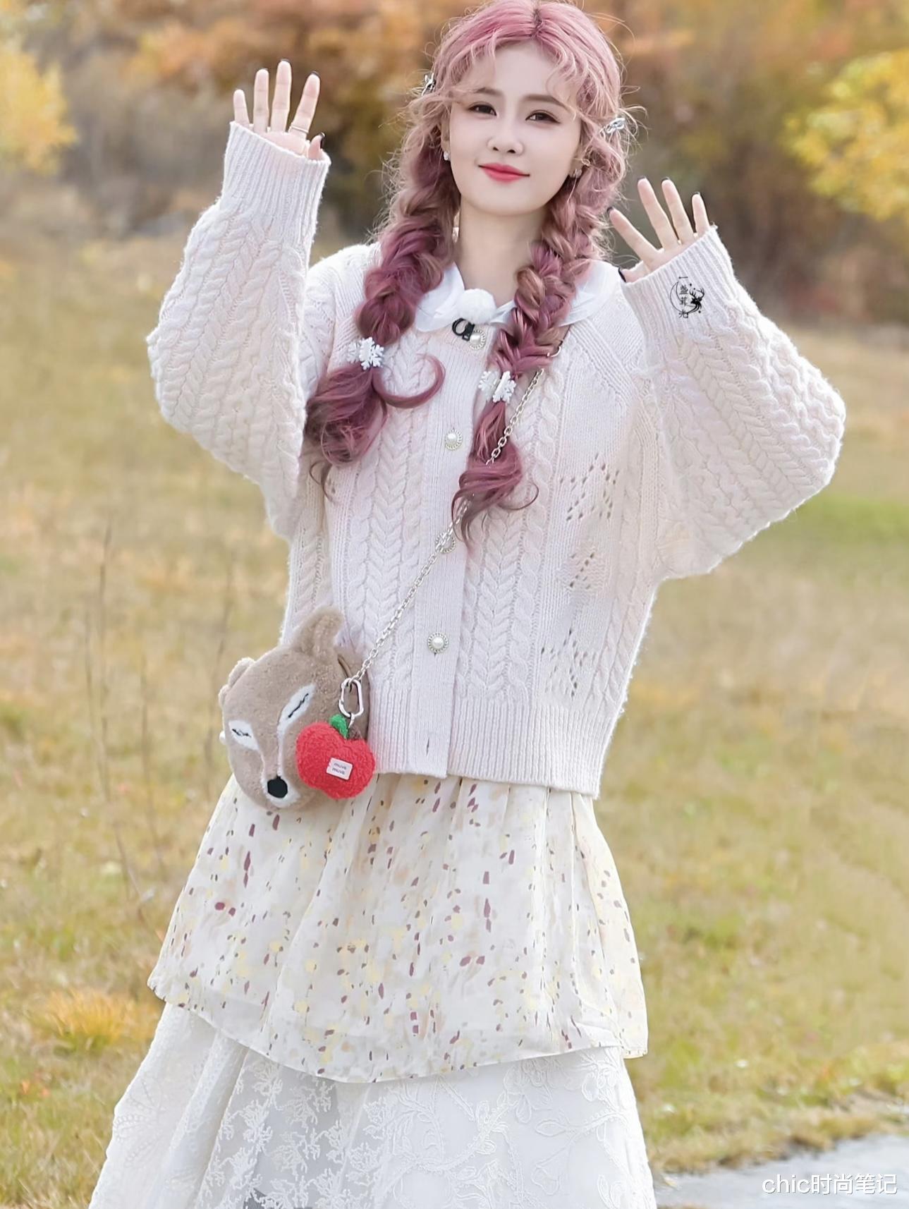 米白色针织开衫搭配蛋糕半身裙,层层叠叠的蛋糕裙层次感分明,自带古早森系穿搭氛围感。搭配粉色双麻花辫,妥妥的古早氛围感穿搭女神。