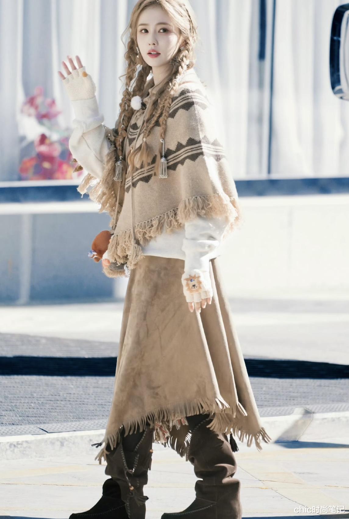 略带民族风的卡其色针织披风,针织流苏温柔又治愈,搭配同款不规则流苏半身裙和棕色靴子,妥妥的秋日糖炒栗子~