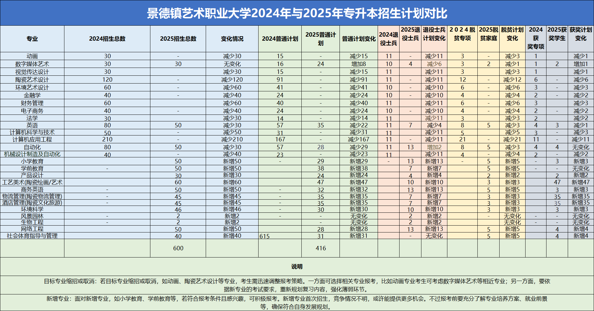 景德镇艺术职业大学专升本2025年共招900人,普通计划招生416人,2024年招生600人,普通计划招生615人,相比2024年,2025年专升本招生共扩招300人。希望每位江西专升本考生都能找到并且考上自己的理想院校与专业。