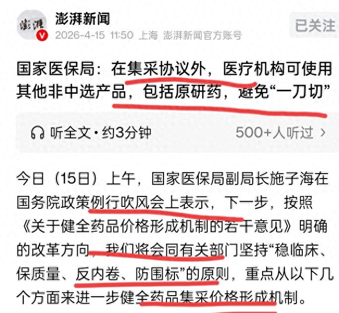 如果大家还有印象的话,之前曾经有一段期间,针对集采药和原研药的药效引发大家的讨论,有医学专家就建议过,针对患者的实际需要,允许医院在给病人看病的时候,让病人有多一个选择,到底是用集采药还是用进口的原研药!