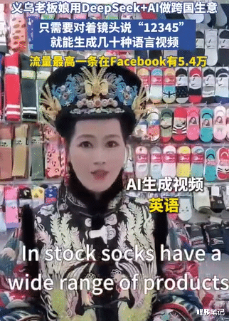 义乌老板娘傅江燕,靠着AI工具10分钟生成外语视频,一条文案卖空2000万双袜子,老外排队加微信下单!这哪是做生意?简直是开挂!