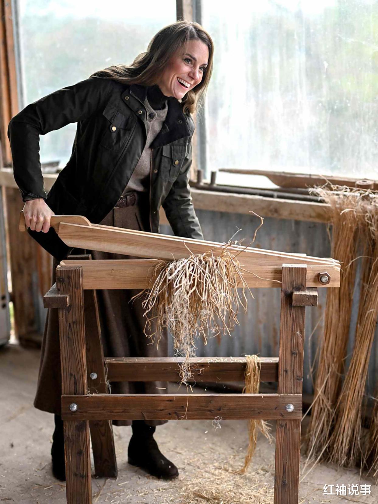 在泰隆郡的这家亚麻农场,凯特王妃亲自尝试了一台修复的传统机器,用于“打破和打碎”亚麻,以实际行动支持着生态意识的亚麻种植复兴。