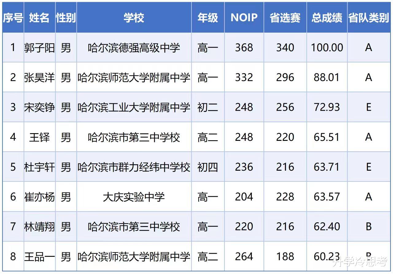 由上图可知,全省信息学奥赛省队共有8人组成,全省信息学奥赛状元来自哈尔滨德强高中,该校有1人入围信息学奥赛省队。