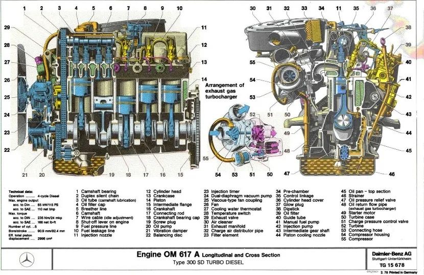 OM617不但性能更加出众,还继承了先辈皮实耐用的特性。它被认为是有史以来最可靠的发动机之一,寿命通常可达100万公里。正是这样稳定的表现,让Mercedes的柴油车在北美风靡一时。OM617的成功,也让Mercedes有了继续升级五缸发动机的信心。为了规避3000cc高一级的排量税,他们将缸径象征性缩小了0.1mm,从而将排量限制在2998cc。他们还通过将压缩比提高至21.5:1、更换更高角度的凸轮轴和优化缸盖设计,使OM617的最大马力提升至88匹/6400转。在此基础上,Mercedes又开始掂量着推出一个涡轮增压版本的OM617。增加涡轮的OM617在命名上多了个尾缀,叫做OM617A,峰值扭矩250N·m/2400转、最大马力115匹/4000转。