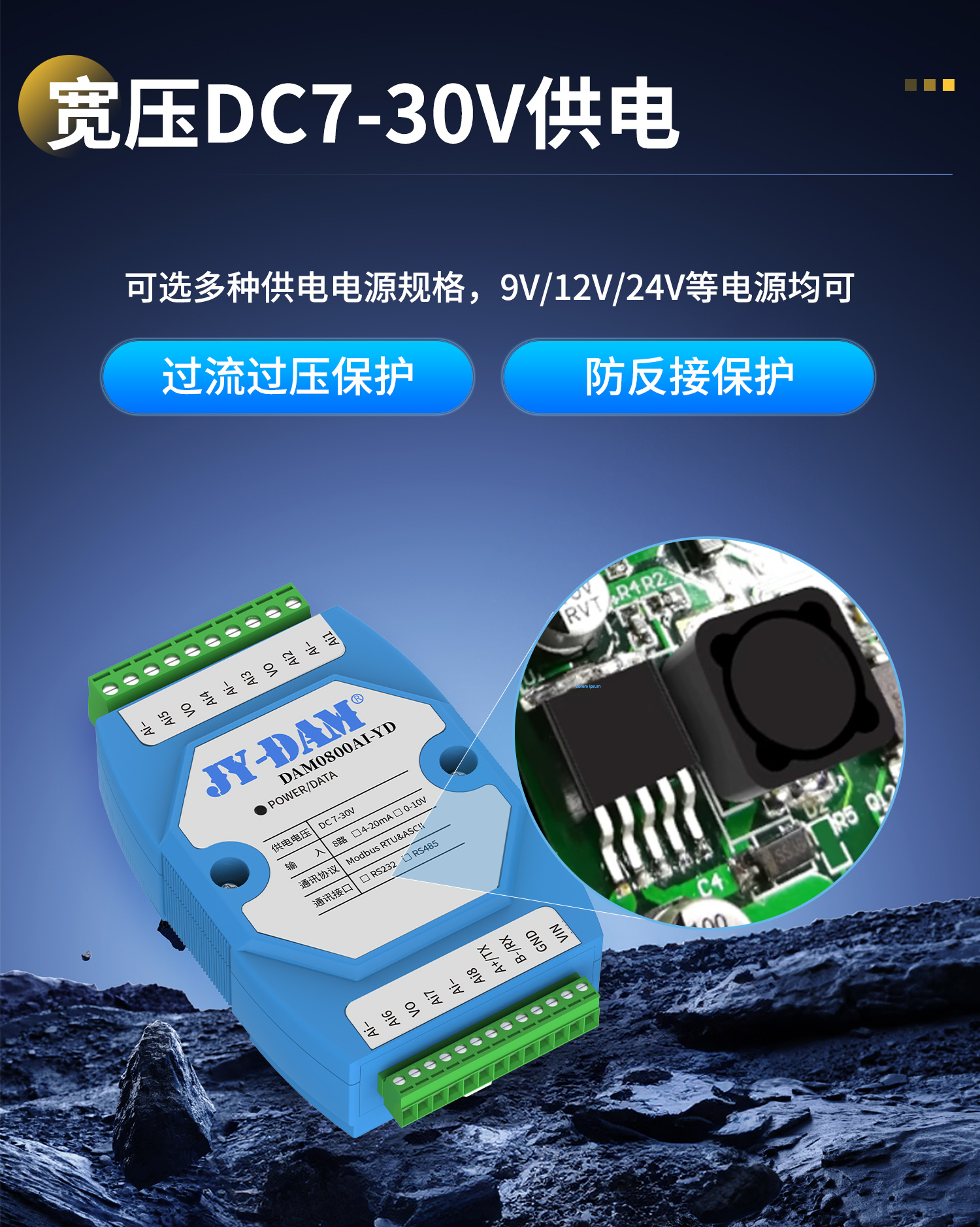 模块电源输入端具备反极性保护功能,即使误将正负极接反,也不会损坏模块,有效避免现场施工失误带来的设备损失。