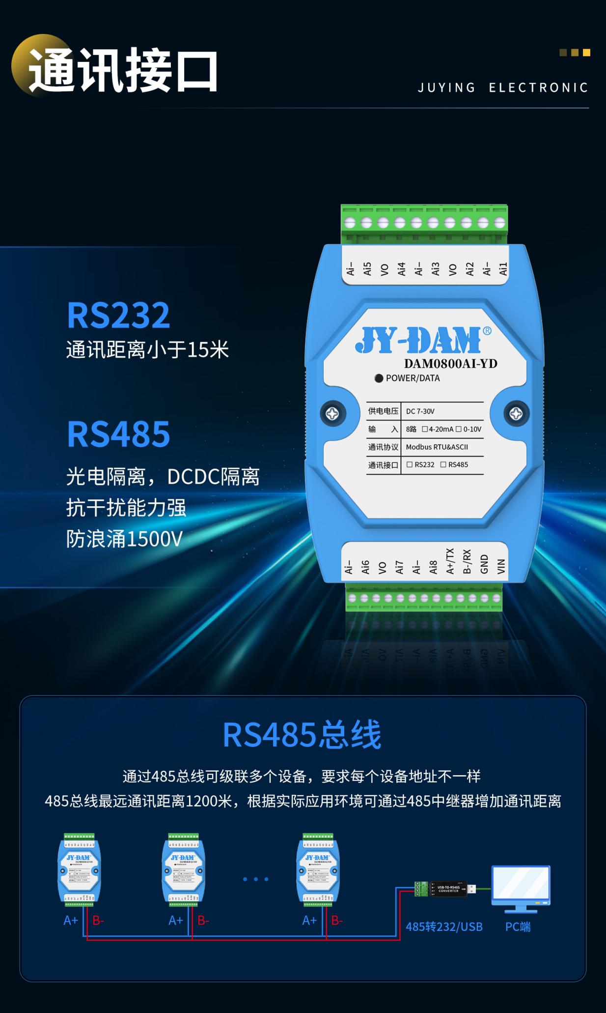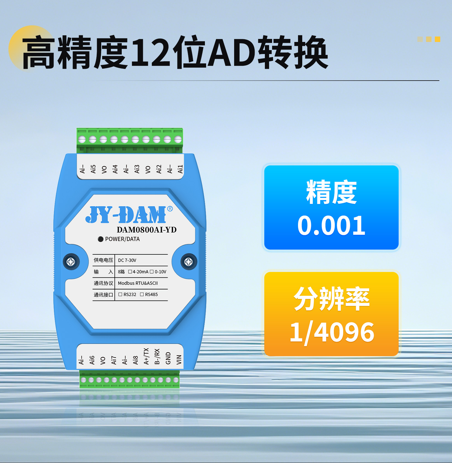采用 12位 ADC 进行模数转换,综合采集精度可达 0.1%(千分之一),满足一般工业过程控制与监测场景对数据准确性的要求。