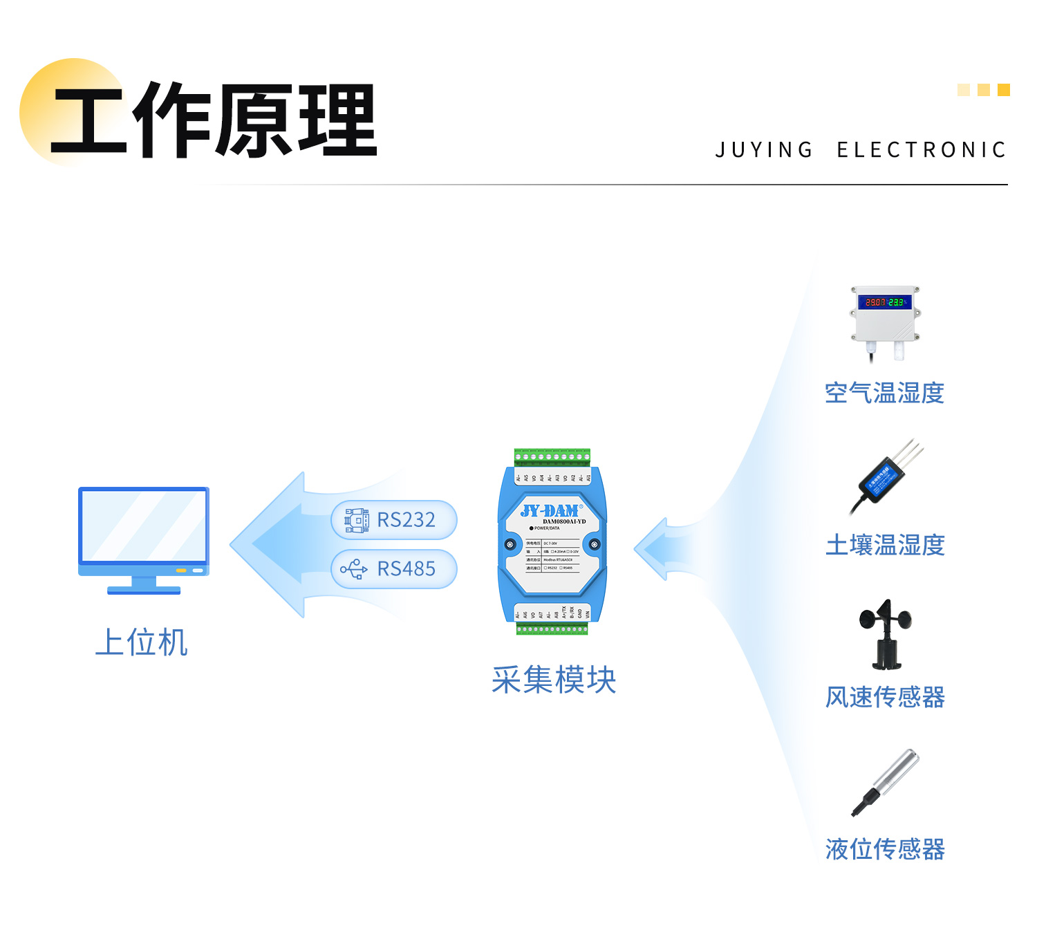 支持 0–5V / 0–10V / 4–20mA 标准模拟信号输入,覆盖工业现场绝大多数传感器输出类型。