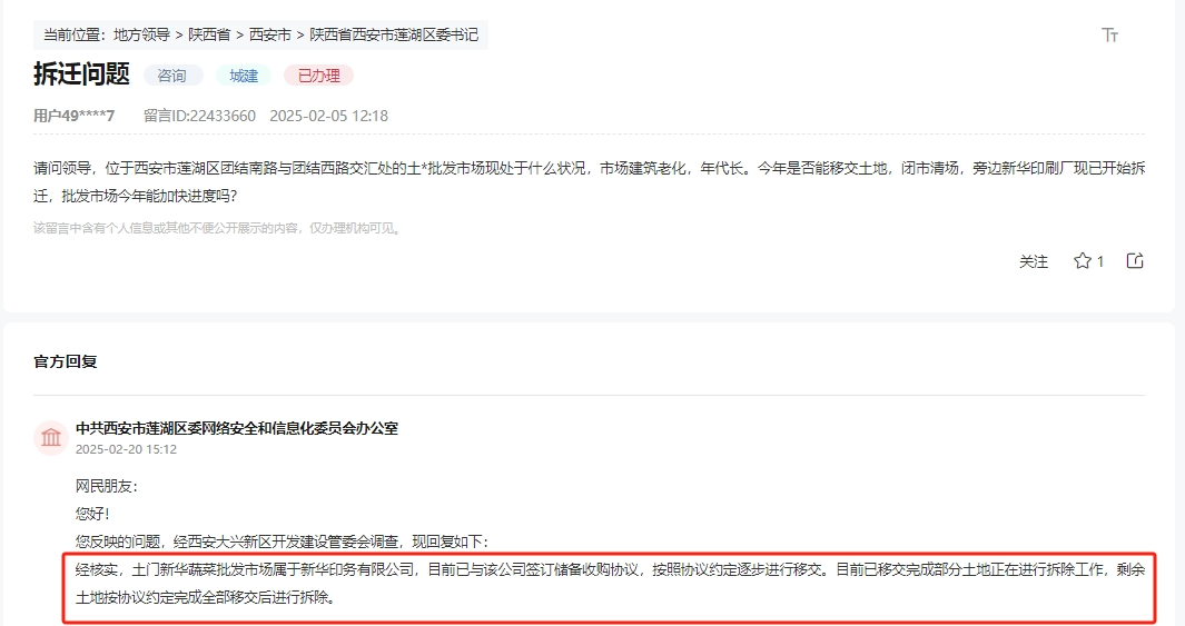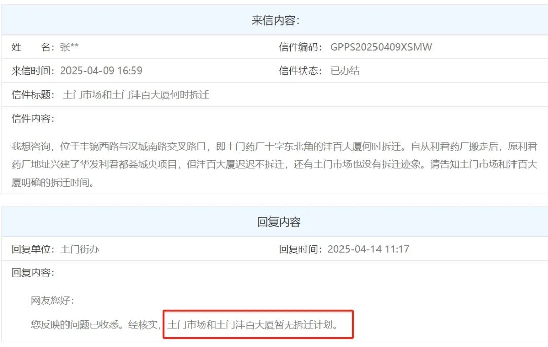 另外,关于土门市场、土门沣百大厦,官方回复中也暂无拆迁计划(截至4月14日)。