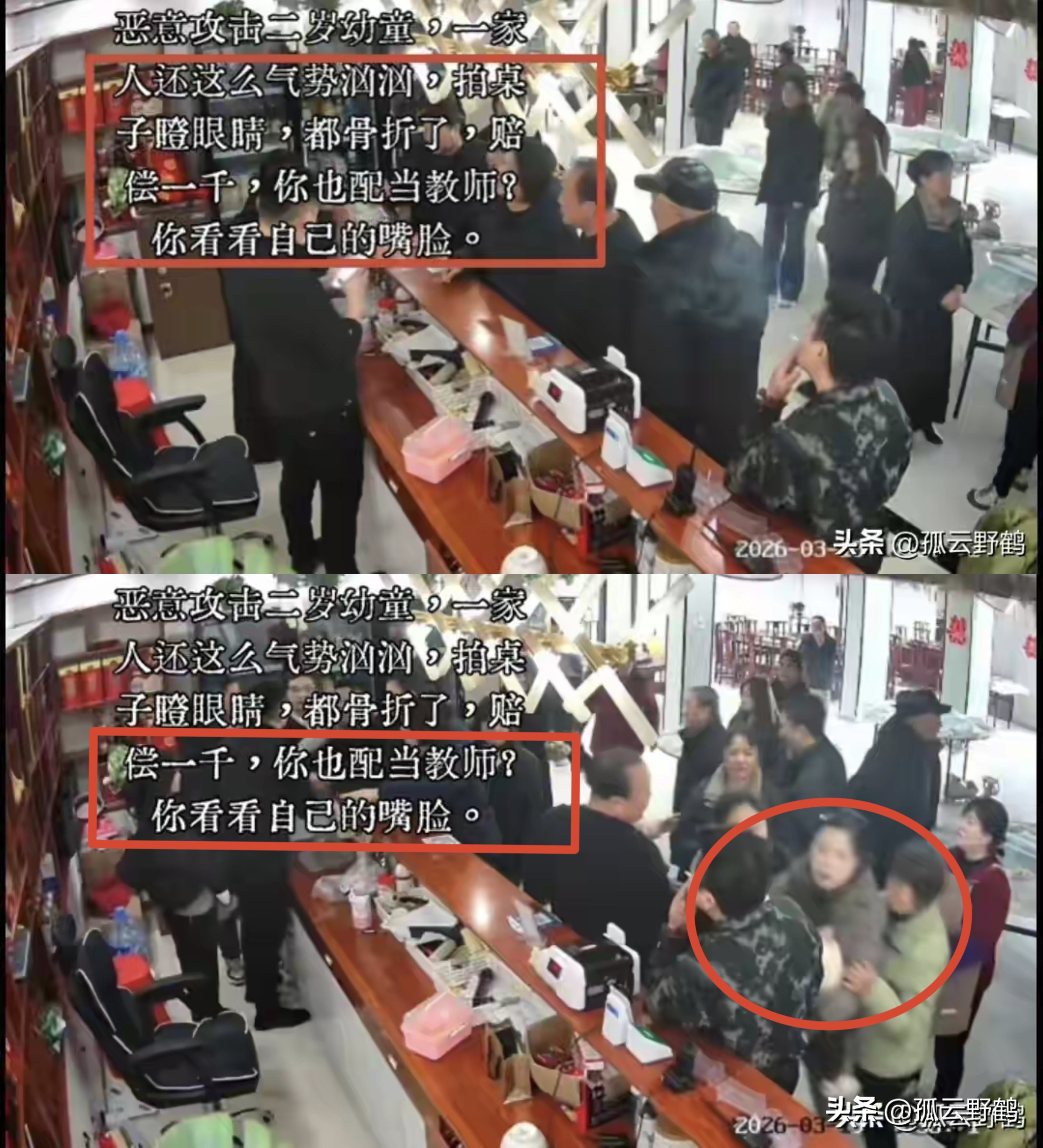 得知店主不愿意和解,甚至打电话报警后,打人女子抱着孩子挤在中间,跟家属一起拍桌子对店主破口大骂。