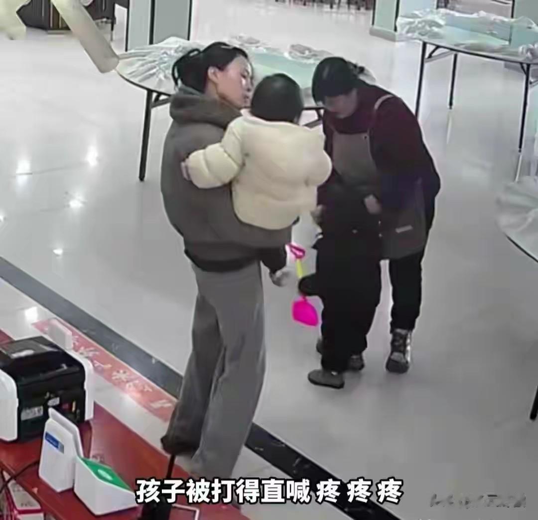 黑衣幼童被打的直喊疼,而站在她身边的服务员却没有阻止,只是低头看着黑衣幼童,随后想将黑衣幼童带到店主身边。