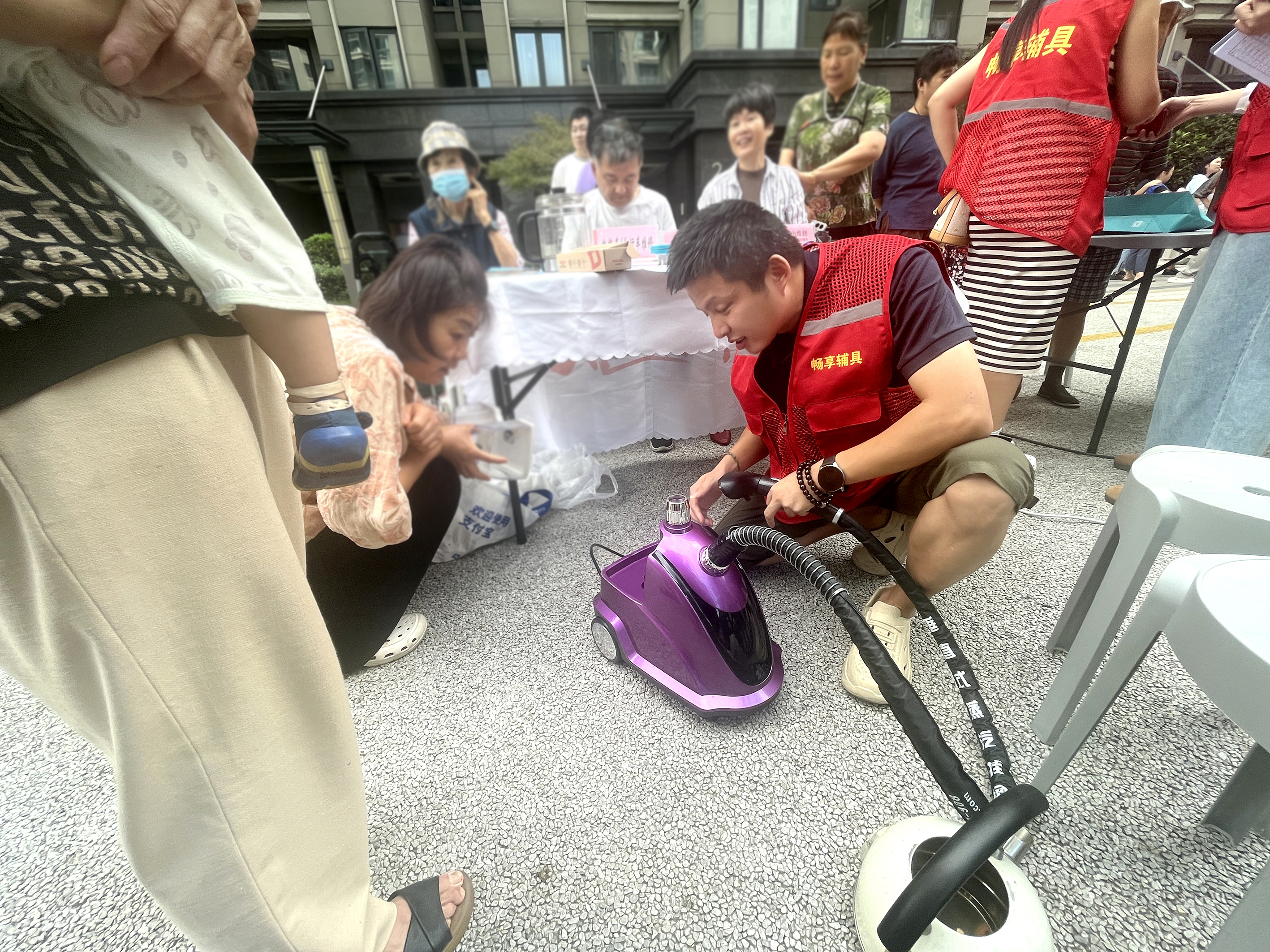 便民维修区是此次活动的“人气阵地”,来自滨江区畅享辅具综合服务中心的志愿者们分工明确、动作娴熟,集中为居民解决各类物品维修难题。针对居民日常使用的生活用品,从自行车零件加固、轮胎补气,到吸尘器滤网清洁、电路故障排查,再到热水壶底座更换、线路安全检测,每一个步骤都严谨细致,确保修复后的物品能安全正常使用。