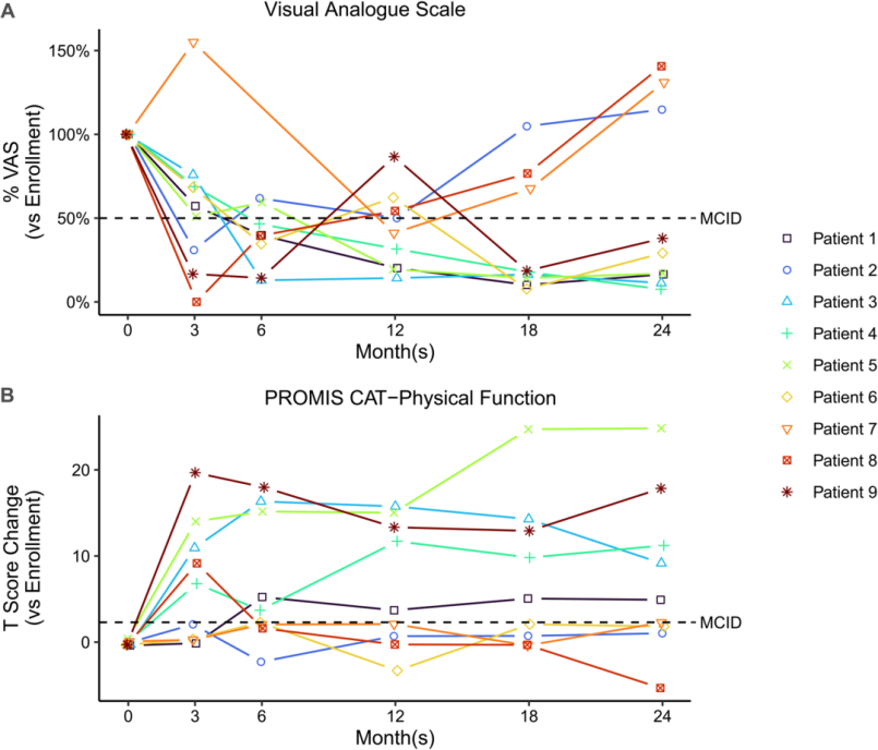 疼痛显著改善:66.7%的患者在12–24个月随访期间,疼痛视觉模拟评分(VAS)下降超过50%,达到临床有效标准;
