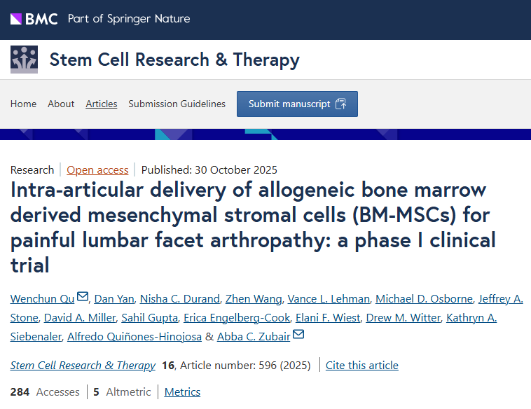 近期,美国佛罗里达州杰克逊维尔市的梅奥诊所完成了一项关于“关节内注射异体骨髓间充质干细胞(BM-MSCs)治疗疼痛性腰椎小关节病”的I期临床试验,相关结果已在国际期刊《Stem Cell Research & Therapy》上发表。该研究初步证实,关节内注射BM-MSCs干预LFA具有良好的安全性与潜在疗效。