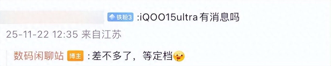 今天,有网友询问博主@数码闲聊站 “iQOO15ultra有消息吗”,这位博主表示“差不多了,等定档”。